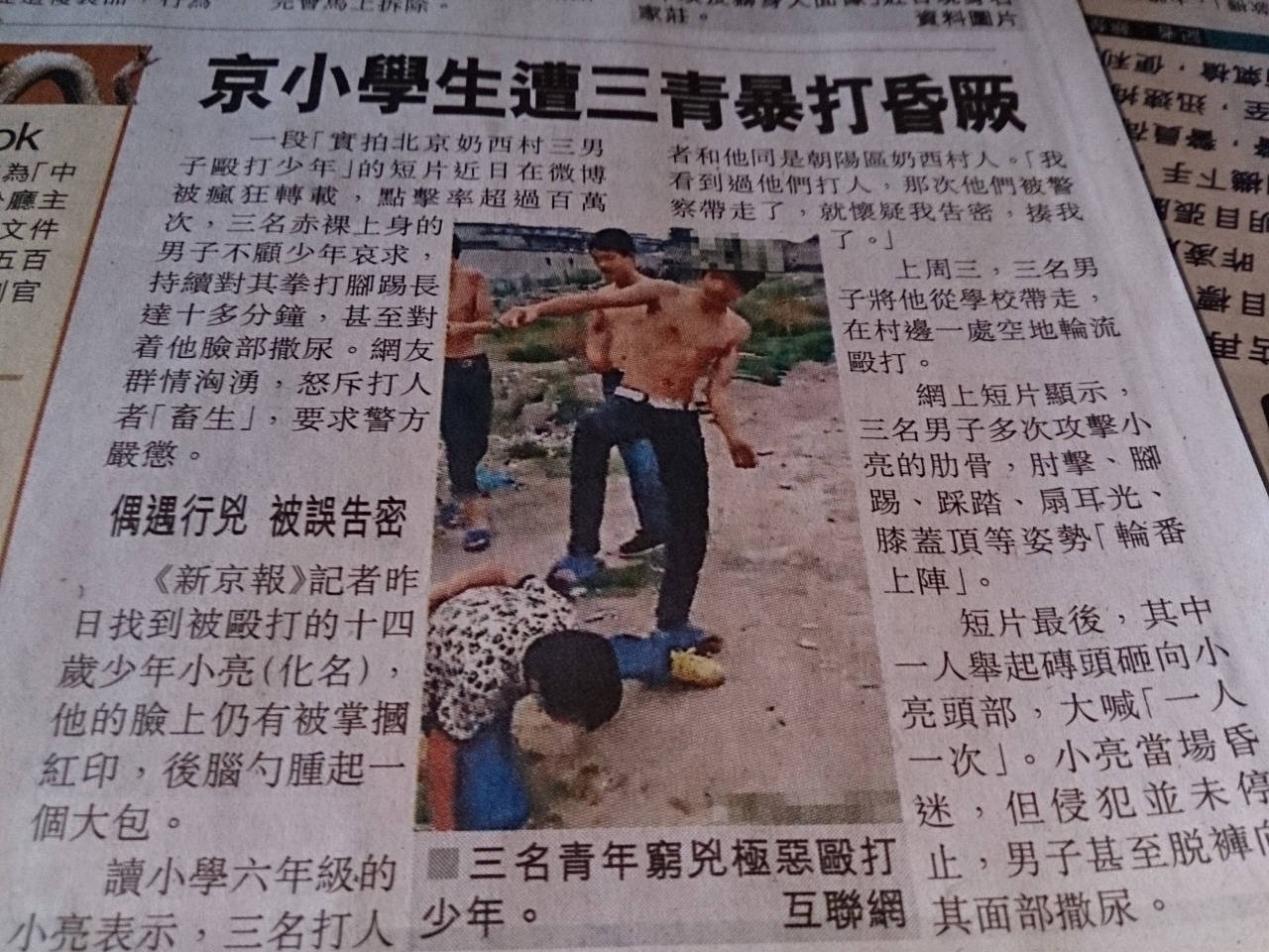 なぜなら右の写真でペキンのアンちゃん達が、ささいな理由で小学六年生を半殺しにしているのを見れば判るように、漢人こそは、絶対有利の場合のみしか武力に訴えれないヘタレた人種だからである。