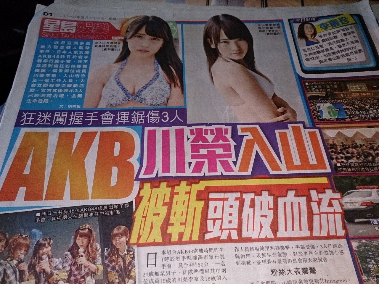 一昨日飛行機に乗ったら新聞をくれたので開けてみたらトップニュースがAKBがのこぎり男に襲われる... だった。 世界にはバカしか生きていないのかよ?