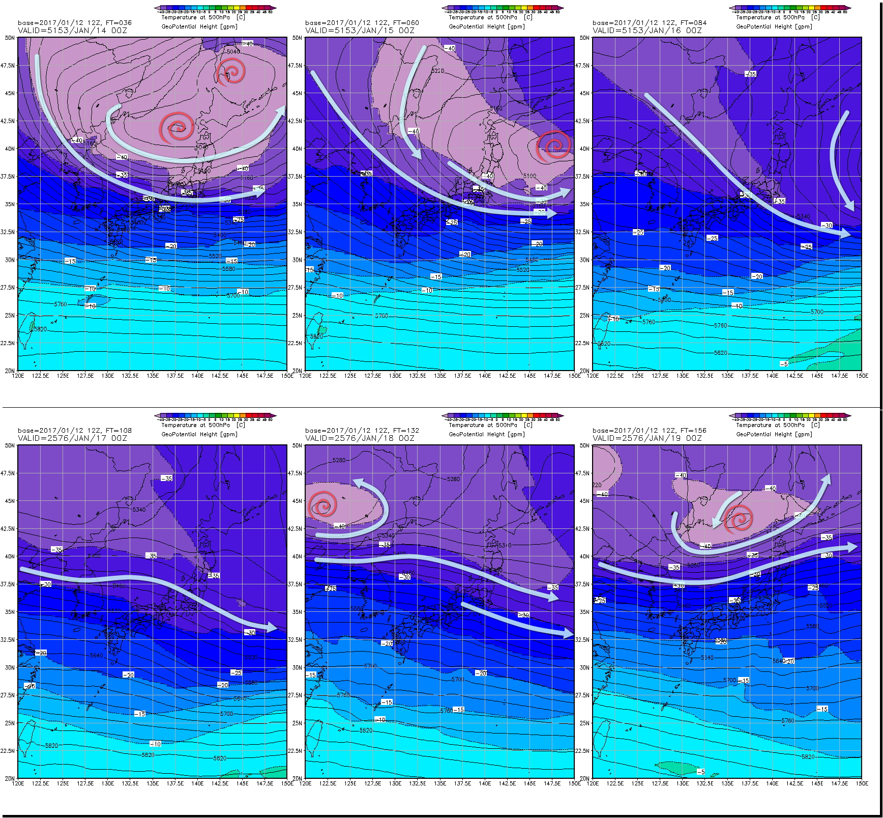 寒冷渦(赤の渦巻き)が通過するのは、明日14日(土)と明後日15日(日)ですから、ご存じのように寒波のピークに。16日(月)以降は、いったん寒気が抜けますけど、偏西風が北陸付近にずっと停滞。