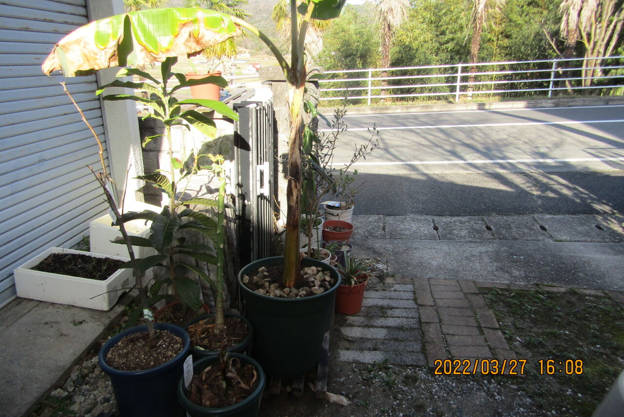 アイスクリームバナナは奥の緑色の鉢に植え替えです。