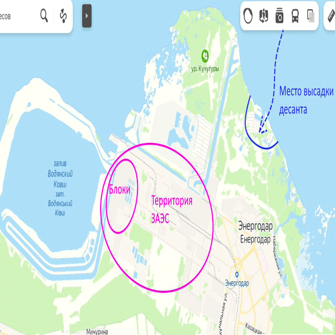 下の地図で、紫色の線は原子力発電所の位置を示しています。 青い線は、ボートでやってきて原発から少し離れたところに上陸したウクライナ軍のルートです。