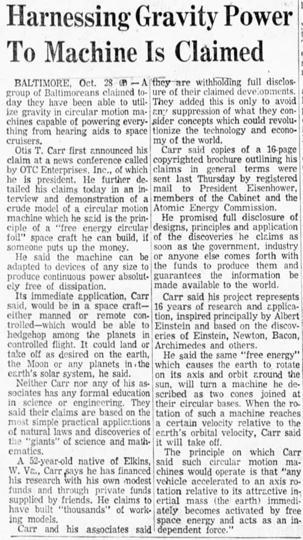1957年、カーは広告主から最も偉大な科学者と宣伝され、動力源の解決策、「キャロット・グラビティ・モーターによるフリーエネルギーの生みの親」と呼ばれるようになりました。