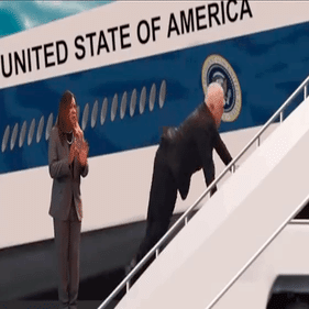 サウジのMBCチャンネルは、バイデンが手を伸ばして実在しない人物を振ったり、ステージで迷子になったり、エアフォースワンの階段を転がったりする様子を描いた。