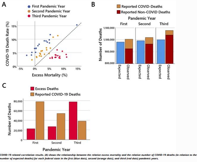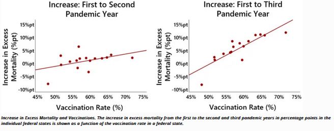 この研究のプレプリント論文のタイトルは、『Differential Increases in Excess Mortality in the German Federal States During the COVID-19 Pandemic (Covid-19パンデミック中のドイツ連邦州の過剰死亡率の差異的増加)」と題され、ドイツのレーゲンスバーグ大学の心理学教授であるクリストフ・クーバントネル博士[Christof Kuhbandner, PhD]とオスナブリュック大学の数学者マティアス・ライツナー教授[Prof. Matthias Reitzner]によって実施された。>その画期的な研究では、効果的なワクチン接種で予想されることとは反対に、負の相関の代わりに正の相関が観察されたことが判明した:連邦国家でより多くのワクチンが投与されるほど、過剰死亡率の増加が大きくなっていた。