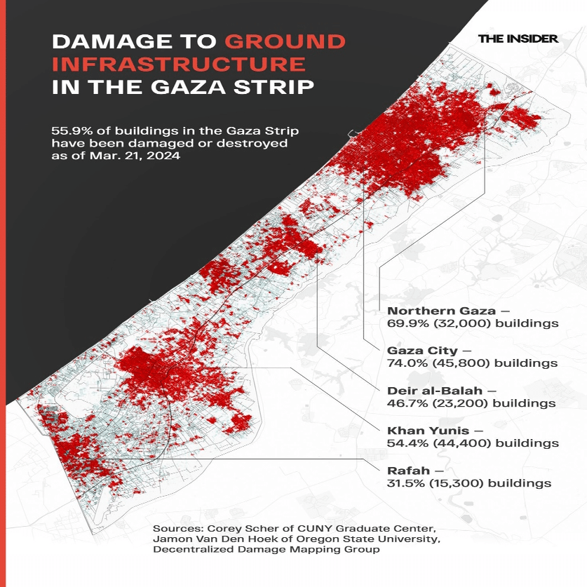 旧態依然とした現状を引き離す力が連鎖し、相互に補強し合う中、私たちは崩壊と暴力の時代に突入した。下の地図をご覧ください。これは3月末までの破壊状況である。それ以来、破壊のレベルはこの4カ月で高まっている。ガザの他の地域よりも北部の破壊が激しいことに注目してほしい。