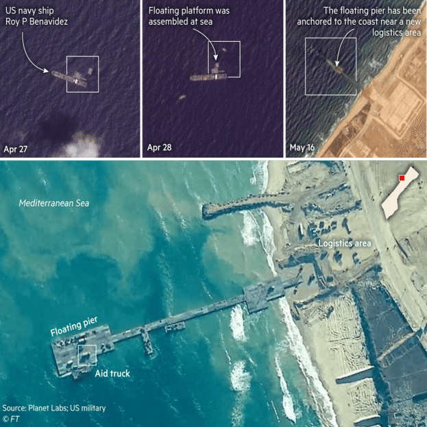 飢饉が迫り、イスラエルがガザ地区の230万人への陸路での援助物資の輸送を制限し続けている中、国連職員は、ガザ海岸に設置された桟橋を「無駄な気晴らし」と表現した。