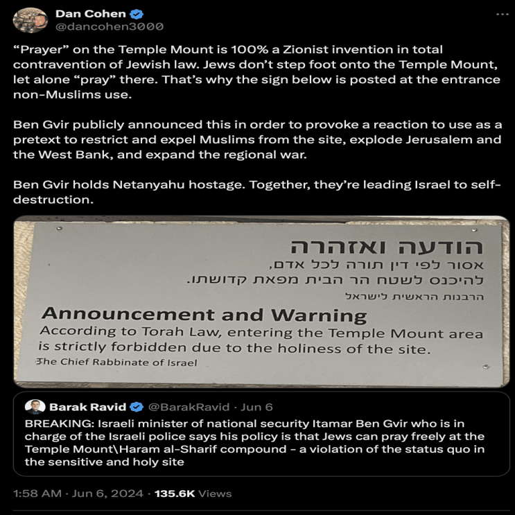 イスラエルは極右のベン・グヴィール国家安全保障相が宗教的緊張を煽り、イスラム教徒にはアル・アクサとして知られる神殿山で祈りを捧げている。ベン・グヴィールは、イスラム教徒を制限してこの場所から追放し、エルサレムとヨルダン川西岸を爆発させ、地域戦争を拡大する口実として使うために、反応を引き起こすためにこのことを公に発表した。 これはイスラエルとその政治イデオロギーがいかにインチキであるかを示すものだ。ユダヤ人は歴史的に神殿山で祈ることをユダヤ教の法律で禁じられてきた。