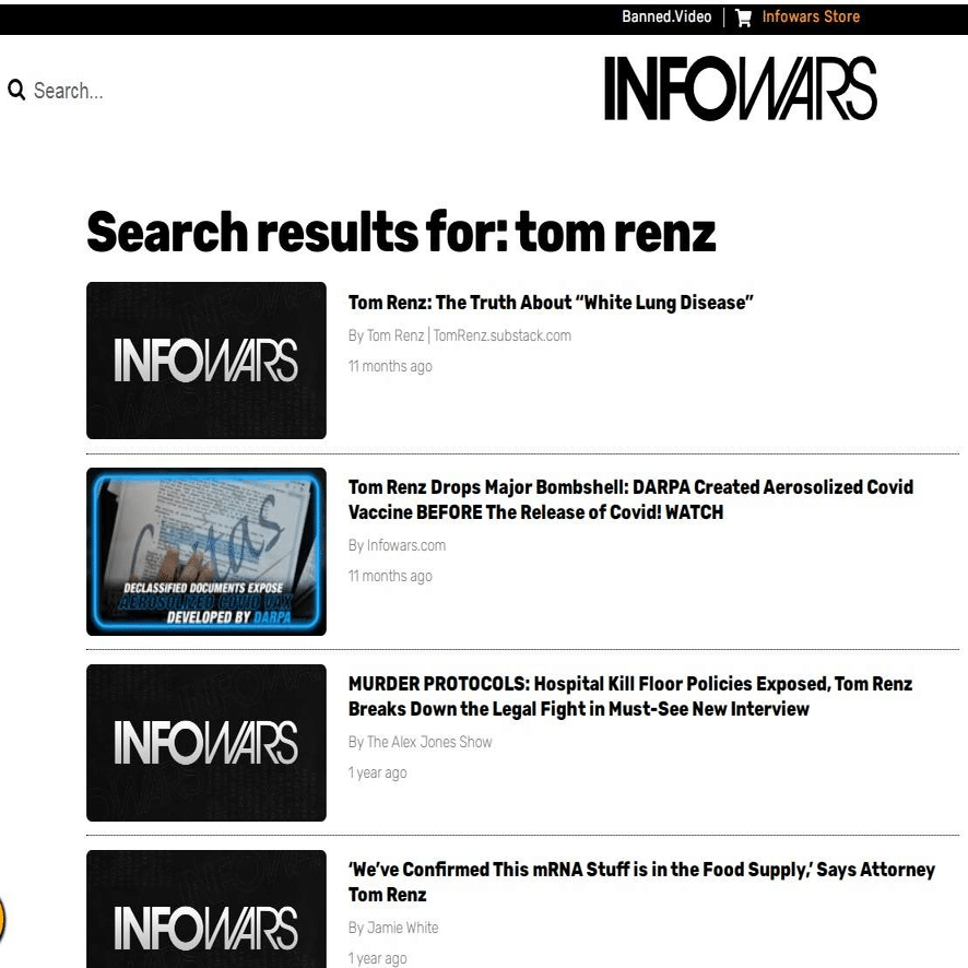 BANNED.VIDEOのウェブサイトでこのビデオを見つけようとしたが、掲載されているトム・レンツの最新のインタビューは11ヶ月前で、スージー・ワイルスに関するアレックス・ジョーンズとのインタビューの前だった。
