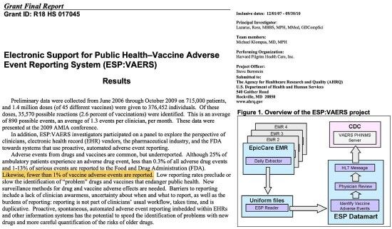 保健福祉省(HHS)が資金を提供し、「ハーバード・ピルグリム医療ケア」で行われたによる報告によると、「VAERSに報告されているワクチンの有害事象は全体の1%未満」であることが分かった。