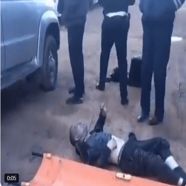 ドローンの発射に関与したとされるトラック運転手の一人が、現場で逮捕されたと報じられています。彼は掴まれ、タックルされ、首にジップタイで縛られ、絞殺される寸前まで追い詰められました(下の写真)。