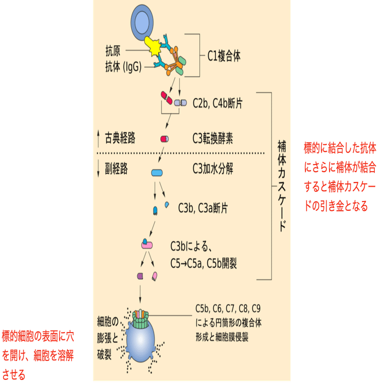 補体は抗体および貪食細胞を補助する血中タンパク質です。補体の役割は抗原をオプソニン化し、さらにマクロファージ等に走化性刺激を与えたり、マクロファージの標的への貪食をサポートする事ですが、もう一つの役割として標的細胞の表面に穴を開ける膜侵襲複合体を構成し、標的細胞を破壊する事があげられます (図4)。