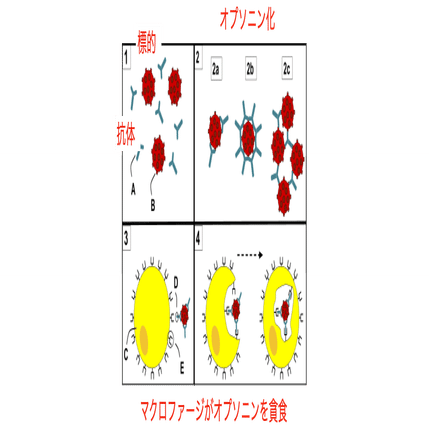 オプソニンとは食細胞に結合して食作用を受けやすくする血清因子です。そしてオプソニン化とは、微生物などの抗原に抗体や補体が結合する事により抗原が食細胞に取り込まれやすくなる現象です。オプソニン化を担う主要な分子には補体のC3bやIgG抗体が知られています (図3)。