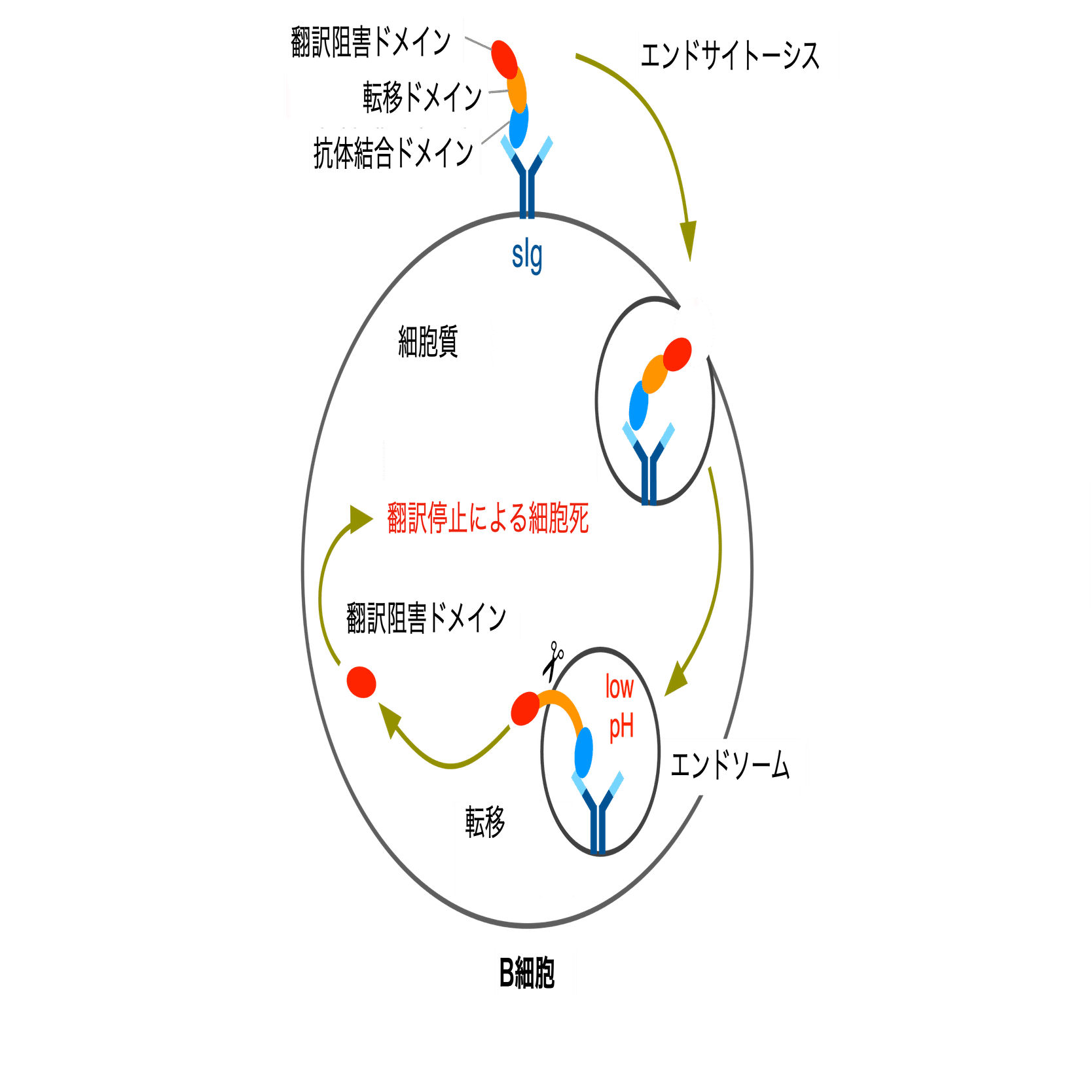 各B細胞は、発現する抗体の抗原特異性またはクラスによって区別されます (図3)。抗体に結合したIgAimは、受容体介在性エンドサイトーシスを介してエンドソームに輸送されます。エンドソームの酸性pHは、移行領域と膜の構造変化を引き起こし、翻訳阻害ドメインが細胞質に放出されます。