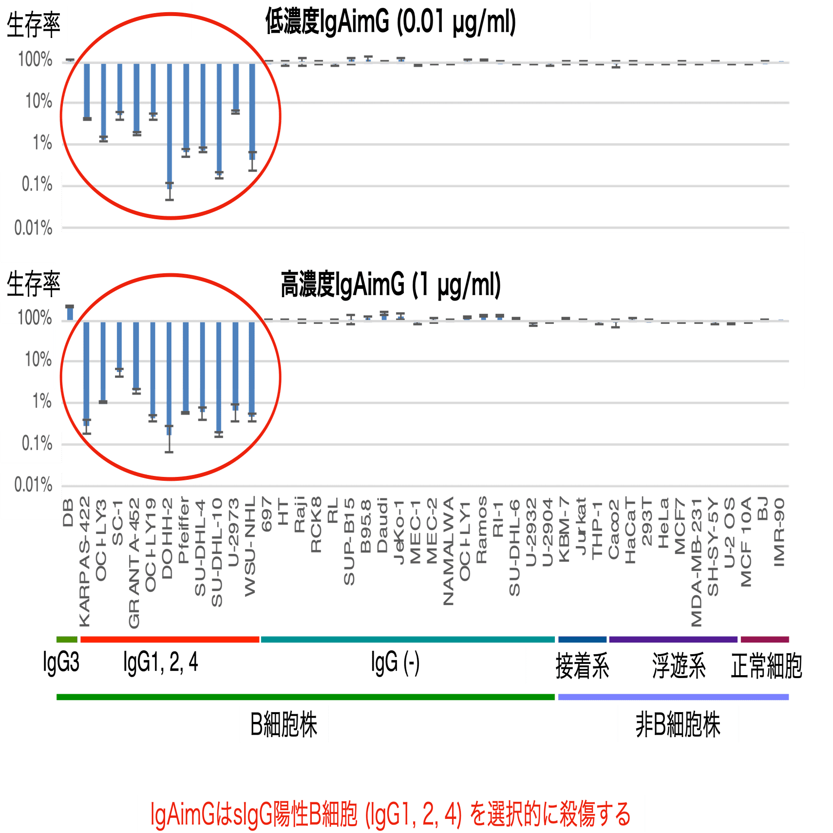 IgAimGはジフテリア毒素の受容体結合領域を黄色ブドウ球菌タンパク質A (Staphylococcal protein A (SpA)) で置き換える事で作成されました。sIgG+ B細胞株を含む細胞株をIgAimG存在下で3日間培養しました。IgAimGは高濃度 (1 µg/ml) でも非IgG発現細胞に対して細胞毒性を示しませんでしたが、低濃度 (0.01 µg/ml) ではsIgG+ B細胞を効率的に殺傷しました (図4)。実際、IgAimGはIgG3 B細胞株DBを除くすべてのsIgG+ B細胞株に対して強力な細胞毒性を示しました。IgAimGはsIg-、sIgM+、およびsIgA+ B細胞株 (sIgG- B細胞株) に対して毒性を示しませんでした。さらにIgAimGはさまざまな臓器由来の非B細胞株に対しても毒性を示しませんでした。