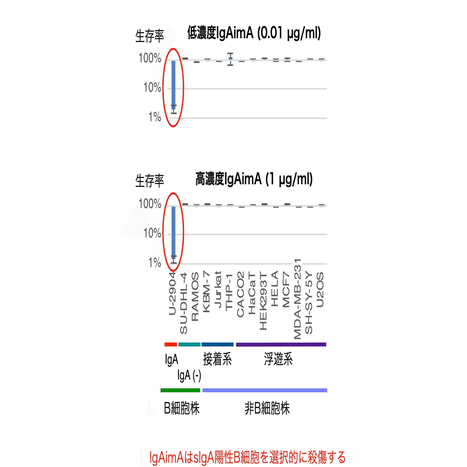前述の黄色ブドウ球菌タンパク質A (SpA) の表面残基13個が置換される事により、標的タンパク質への結合特異性が変化する事が知られていますが、SpAの13アミノ酸をランダムに変化させ、結合特異性の変化に基づいて選択されたタンパク質をアフィボディと呼びます。アフィボディは抗体と同様に多様な結合特異性を有するように設計されています。これらのアフィボディのうち、ZigAはIgAに特異的に結合し、IgGには結合しないようにデザインされています。ジフテリア毒素の受容体結合ドメインをZigAのタンデムリピートで置き換えたものが、ヒトIgAに特異的に結合するIgAimAです。IgAimAは、0.01 µg/mlの濃度でIgA+ B細胞のほぼ99%を効果的に殺傷しました (図5)。注目すべきは、IgAimAの毒性はIgA+ B細胞株に特異的であった事です。他のB細胞クラスや非B細胞株はIgAimAの影響を受けませんでした (図5)。
