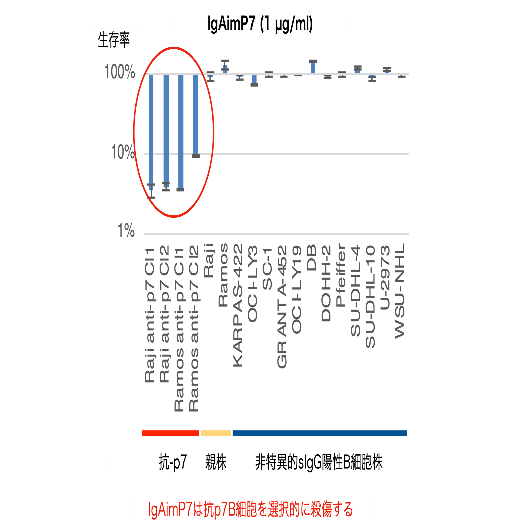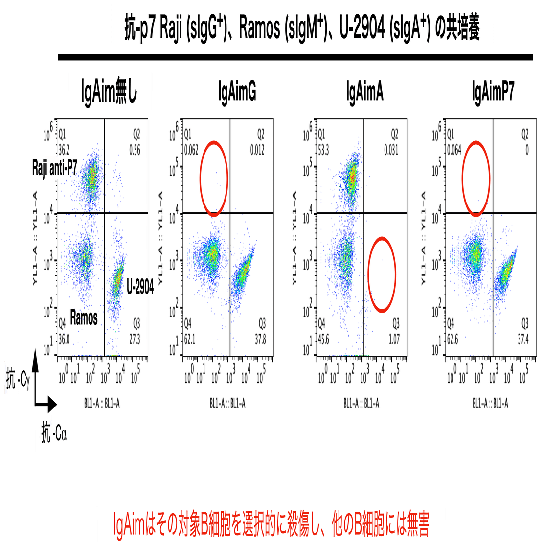 IgAimが特定のB細胞を選択的に除去するかどうかを確定するため、3種類の異なるB細胞系を共培養しました:sIgG+ B細胞株anti-P7 Raji、sIgM+ B細胞株Ramos、およびsIgA+ B細胞株U-2904。各細胞株はanti-IgGおよびanti-IgA抗体で染色され、結果3つの異なるクラスターが得られました (図5)。これらの混合細胞株を、1 µg/mlのIgAimG、IgAimA、IgAimP7を添加した培地、またはIgAimを含まない培地で3日間培養後、各細胞株の割合をフローサイトメトリーで解析しました。IgAimGはsIgG+ B細胞株anti-P7 Rajiを選択的に除去し、RamosとU-2904には無害でした (図7)。同様にIgAimAはsIgA+ B細胞株U-2904を選択的に除去し、他の細胞に明らかな損傷や減少は認められませんでした。抗P7 Rajiは、P7抗原特異的なIgAimP7によっても選択的に除去されました。このようにIgAimは対象となるB細胞以外には明らかな毒性は認められず、IgAimによって細胞が死ぬ際に他の細胞を巻き込んで殺すような作用は見られませんでした。