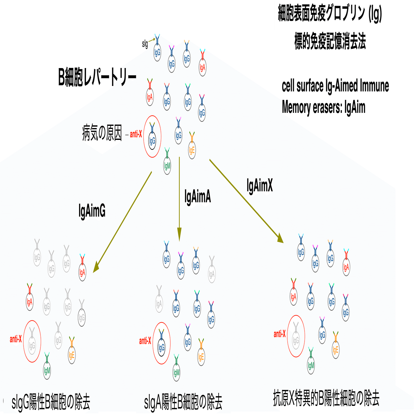 白血病、リンパ腫、または自己免疫疾患などのB細胞疾患は、抗体多様性の副作用として発生し、免疫系の「悪い記憶」として残る。しかし、意識的に何かを忘れようとする事は、覚える事よりもはるかに困難である。トラウマを経験した人々の脳に保存された記憶を考慮すると、悪い記憶以外は無くてはならないものである。細胞表面免疫グロブリン (Ig) 標的免疫記憶消去法 (Ig-Aimed Immune Memory eraser; IgAim) は、B細胞の表面の抗体を標的とする事で、B細胞レパートリーから悪い記憶を選択的に除去する事を目的としている (図1)。IgAim技術は、B細胞白血病、リンパ腫、自己免疫疾患の根治療法開発のための基礎研究である。