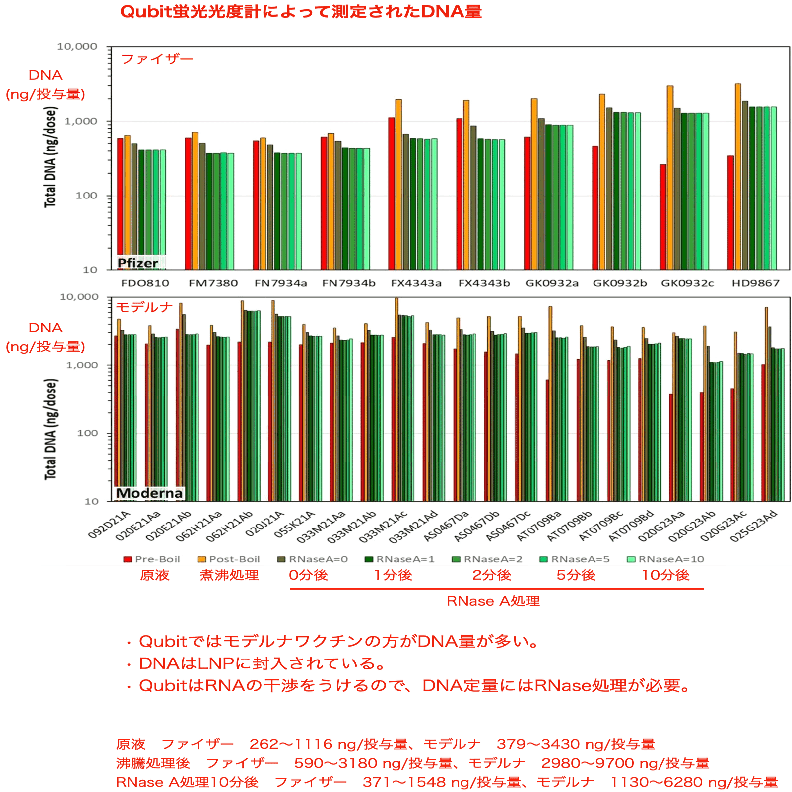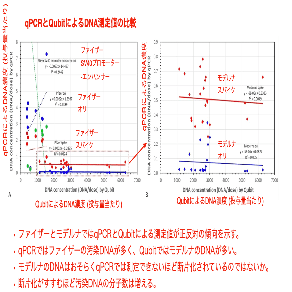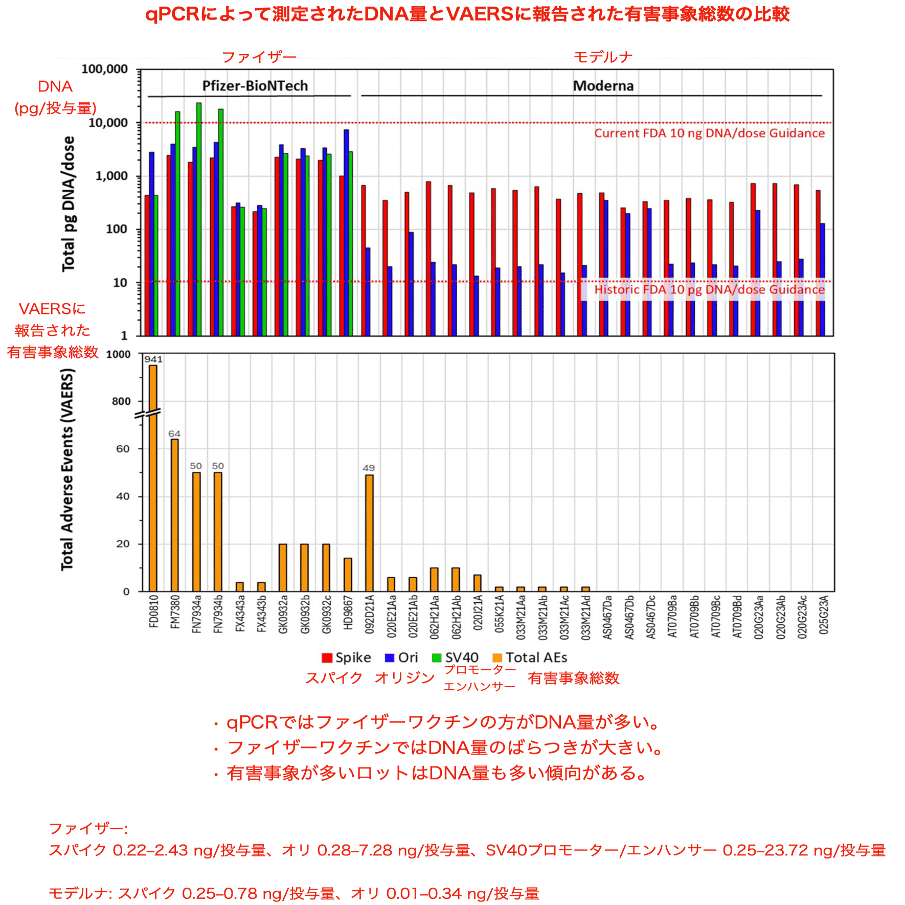 ファイザー、モデルナのmRNAコロナワクチンは小さなDNAに断片化されており、一回投与量あたり数十億から数百億のDNA分子が含まれると見積もられ、さらにはファイザーワクチンには未申告であるSV40プロモーター/エンハンサーも豊富に含まれている事が判明しています。実験ではQubit蛍光測定とRNase A消化を併用した結果、全ワクチンバイアルがFDAおよびWHOが設定した残留DNAガイドライン (10 ng/回) を37~628倍も超過しました。また、qPCR検査では3つのファイザーバイアルがSV40プロモーター/エンハンサーの規制値を超過しました。qPCRでは総DNA量を過小評価するため、DNA量を正確に測定するには複数アッセイを組み合わせる事が重要です。