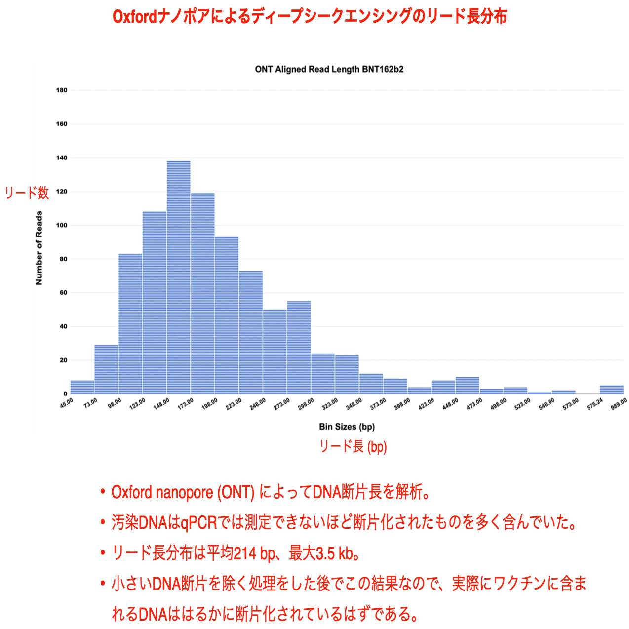 汚染DNAの定量において重要なのは質量だけではありません。その「分子数」こそがより重要になるのです。なぜなら汚染DNAのそれぞれの分子がゲノムに統合され、ゲノムを傷付ける可能性があるからです。この危険性とは例えるならば、ピストルの弾丸一発に対しての散弾銃の銃弾ようなものです。そして、その分子数を推定するためにはDNAがどれほど断片化されているのかを知る必要があります。オクスフォードナノポアテクノロジー (ONT) シークエンサーは長鎖のDNA配列の解析に適しているため、実験では断片長の解析にONTシークエンサーが使われました。