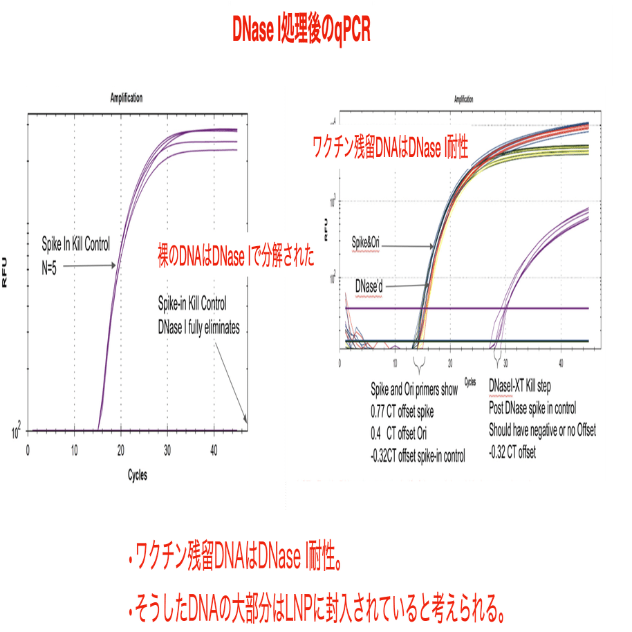 ワクチン中のDNAはどれも「裸」のDNA分子として存在しているとは限りません。裸のDNAをDNase I-XTで処理するとqPCRではほぼ検出されなくなりましたが、ワクチン残留DNAはDNase I-XTには耐性でした (図6)。基本的に大部分のDNAはLNPに封入されており、細胞に導入されやすい状態にあると考えられます。