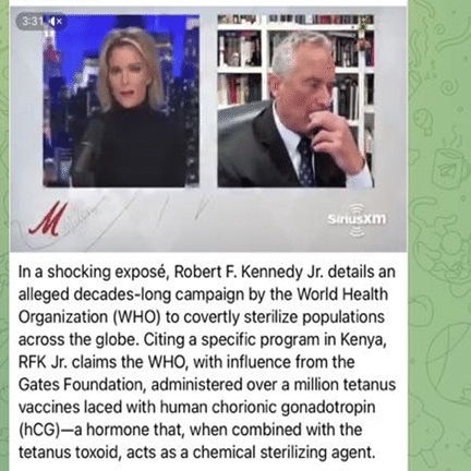 「WHOはワクチンによる人口抑制に長らく取り組んできた。たとえば、ケニアで女性(14歳~34歳)に破傷風ワクチンが接種されたが、このワクチンにはhCG(ヒト絨毛性ゴナドトロピン)が含まれていた。hCGは破傷風トキソイドと結合して、女性を不妊にする作用がある。このワクチンの接種プロトコルとして、6か月の間隔を置いて全部で5回接種する。こうすることで女性の妊孕性を完全になくすことができる。