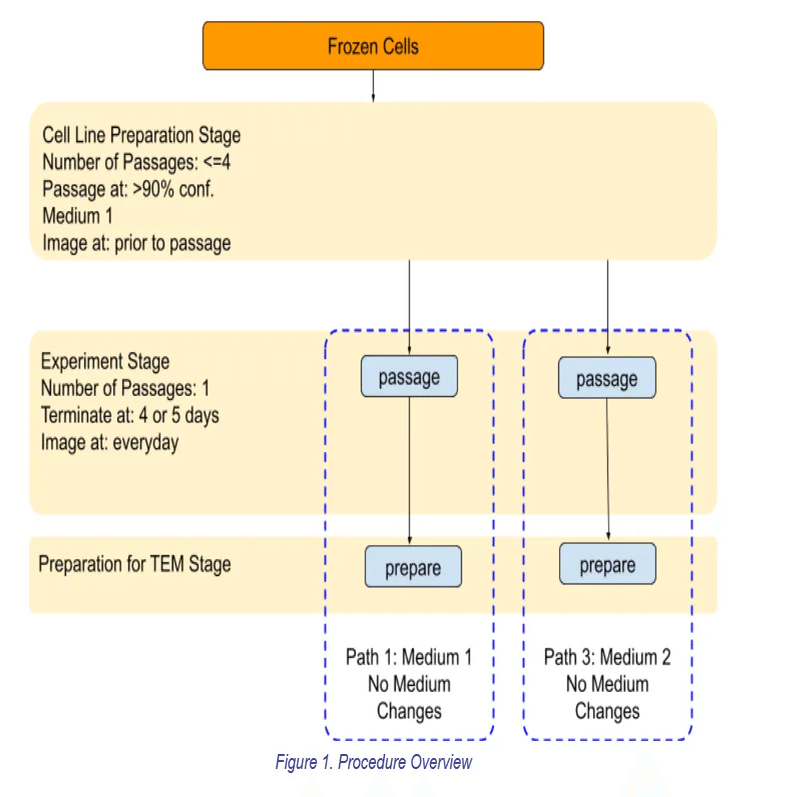 図に示すように、細胞は解凍され、「細胞株準備段階」に向けて継代培養されます。その後、「実験段階」では実験が2つのパスに分岐します。2つのパスで1回の継代培養が行われ、パス1では増殖培地1が、パス2では増殖培地2が使用されます。実験段階のこの継代培養中は培地交換は行われません。実験段階の後、「TEM準備段階」が始まり、細胞サンプルはTEMラボへの輸送に向けて準備されます。最後に、サンプルはTEMラボに送られ、画像化されます。