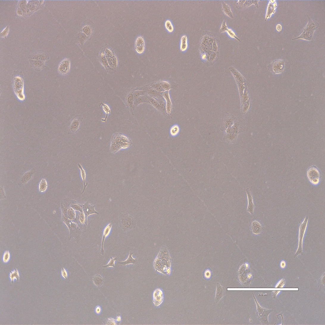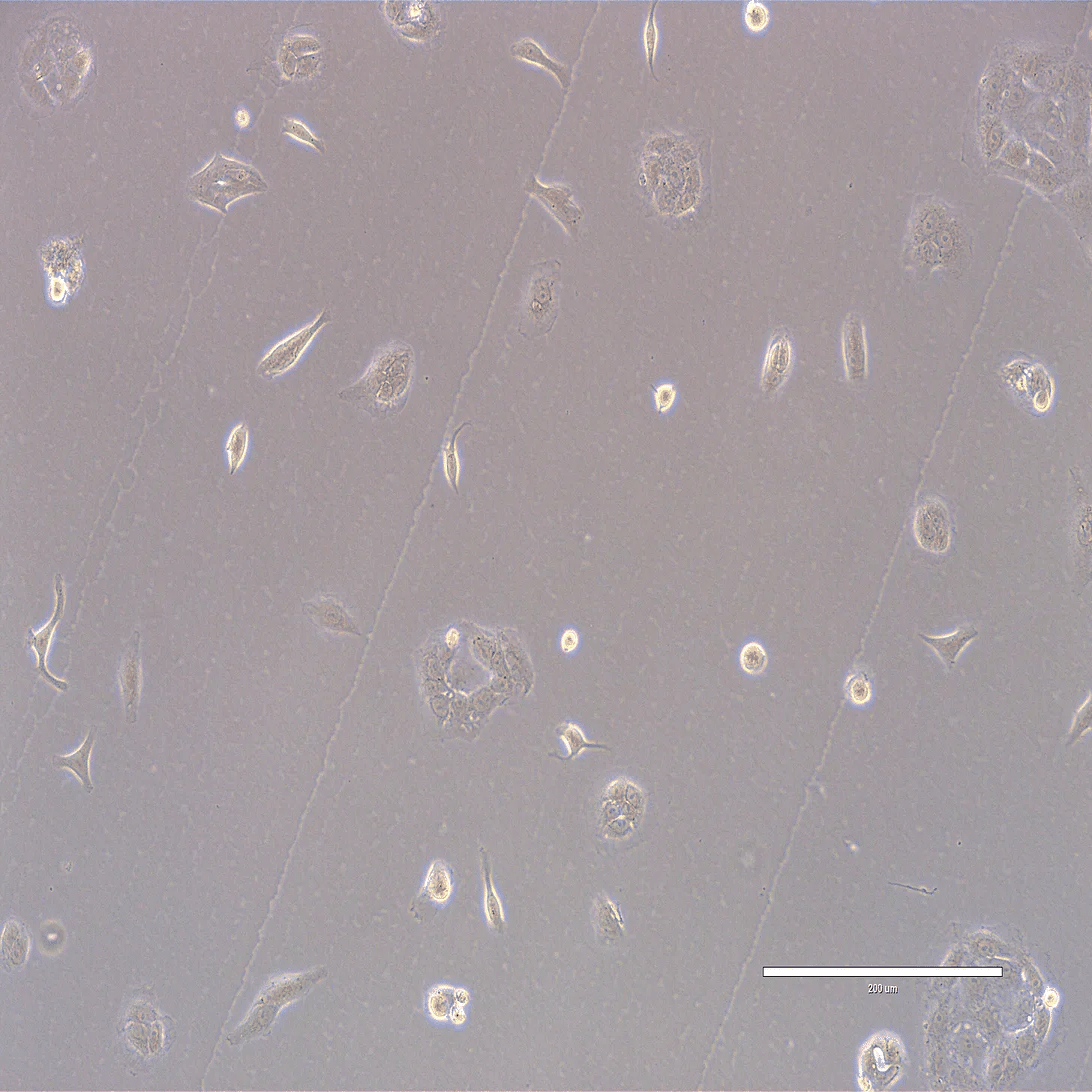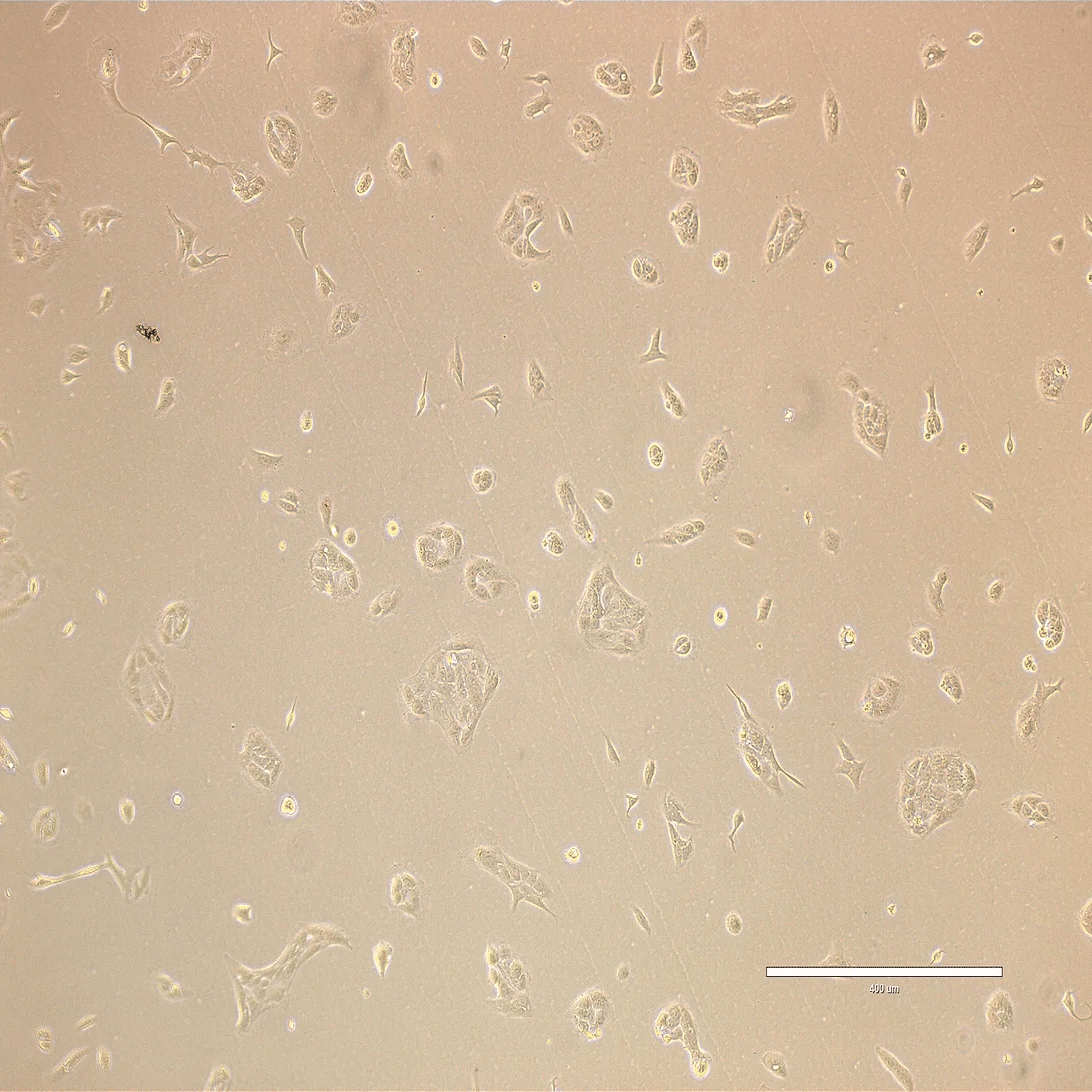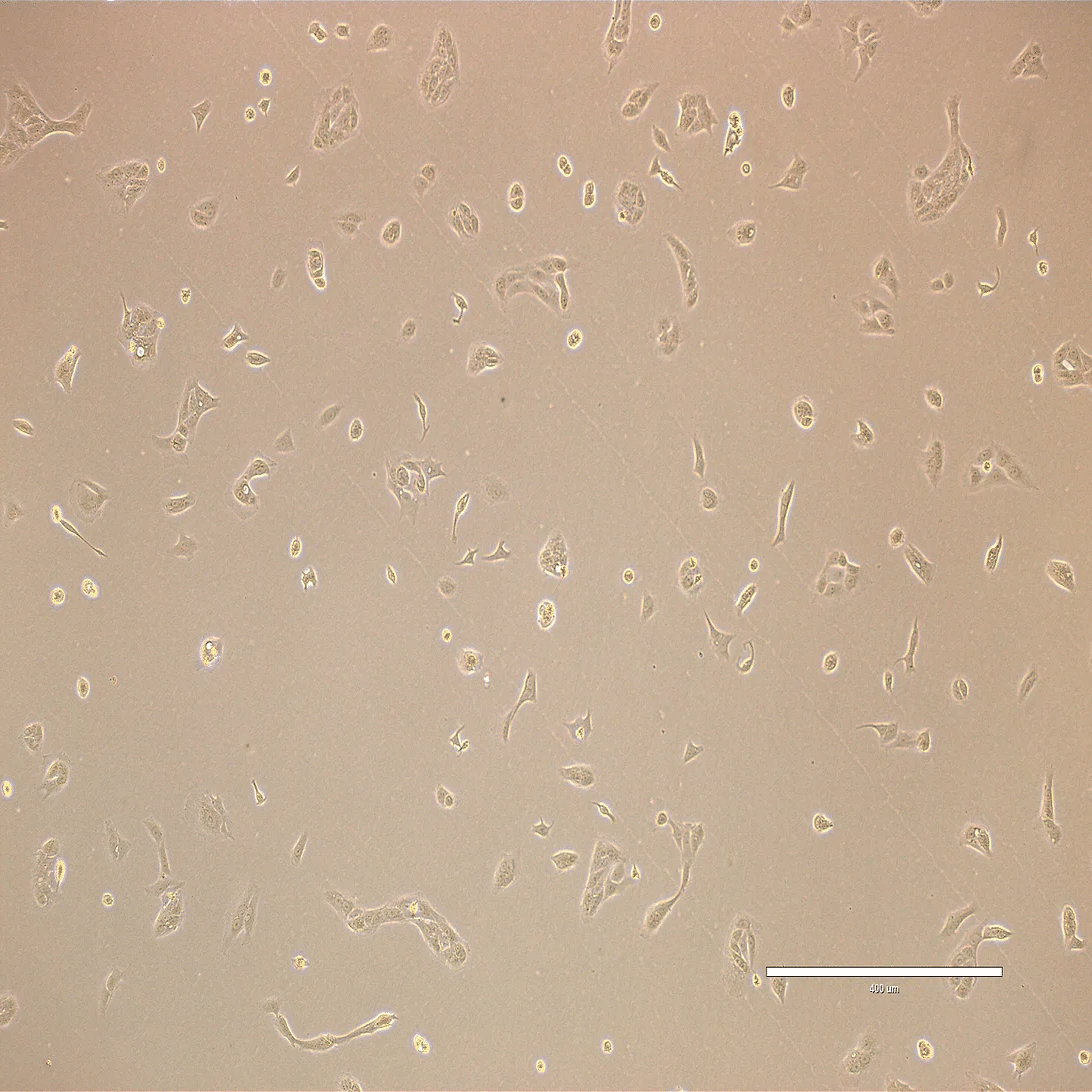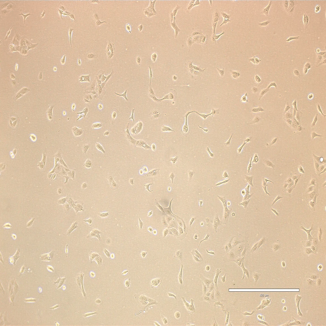 13 日目に撮影された Vero 細胞の画像。細胞はさまざまな形態を示していますが、ほとんどは、ある程度の広がりを伴う細長い形または紡錘形をしており、線維芽細胞様細胞または間葉系細胞の特徴です。いくつかの細胞は丸みを帯びており、これは有糸分裂活動、接着不良、またはストレスの初期兆候を示している可能性があります。全体的な密集度は低く、おそらく 20~30% 程度です。これは、培養がまだ成長初期段階にあり、拡大する余地が十分にあることを意味します。細胞は視野全体に均等に分布しており、時折小さなクラスターが見られます。細胞は健康に見え、膜は損傷されておらず、基質への接着が良好で、剥離や細胞質顆粒化の明らかな兆候はありません。スケールバーは使用した対物レンズを示しています。明らかな汚染の証拠はありません。位相差顕微鏡。