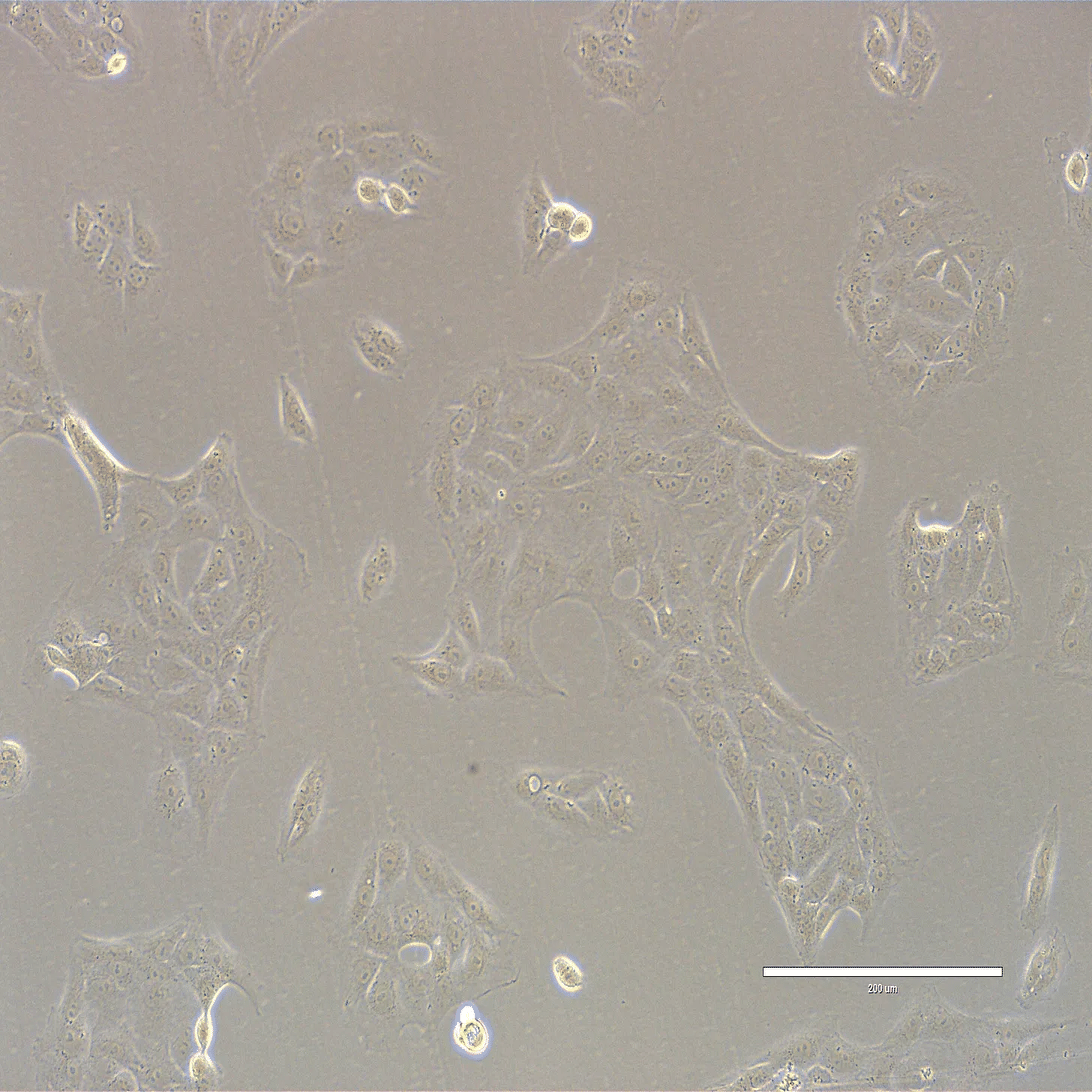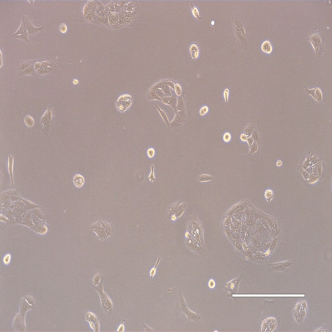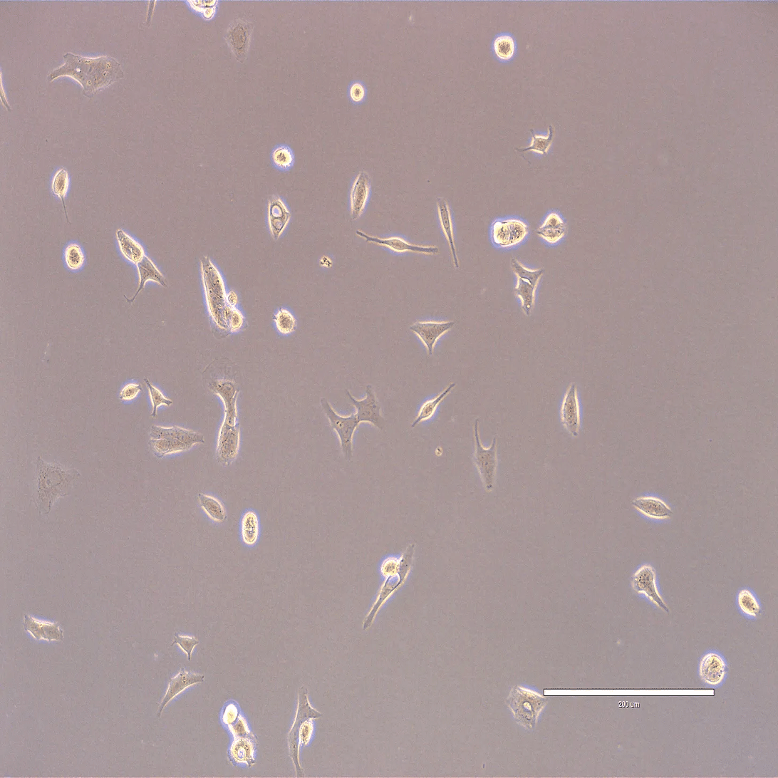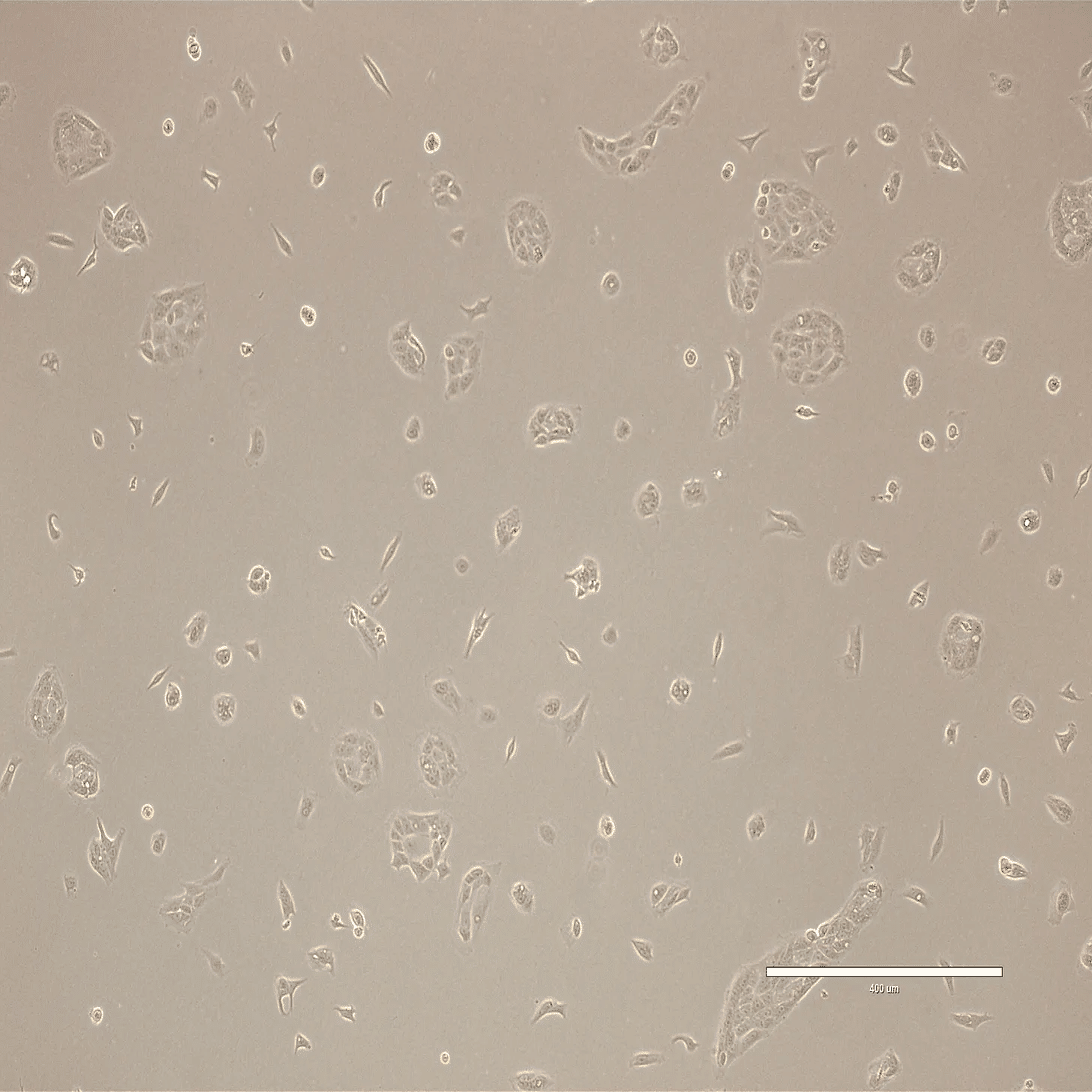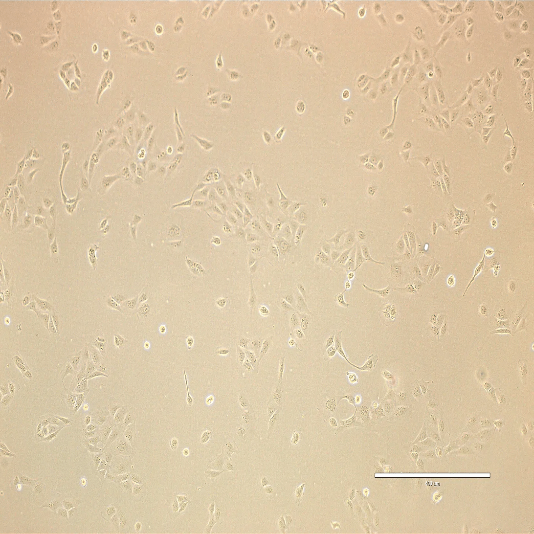 13 日目に撮影された Vero 細胞の画像。細胞はさまざまな形態を示していますが、ほとんどは、ある程度の広がりを伴う細長い形または紡錘形をしており、線維芽細胞様細胞または間葉系細胞の特徴です。いくつかの細胞は丸みを帯びており、これは有糸分裂活動、接着不良、またはストレスの初期兆候を示している可能性があります。全体的な密集度は低く、おそらく 20~30% 程度です。これは、培養がまだ成長初期段階にあり、拡大する余地が十分にあることを意味します。細胞は視野全体に均等に分布しており、時折小さなクラスターが見られます。細胞は健康に見え、膜は損傷されておらず、基質への接着が良好で、剥離や細胞質顆粒化の明らかな兆候はありません。スケールバーは使用した対物レンズを示しています。明らかな汚染の証拠はありません。位相差顕微鏡。