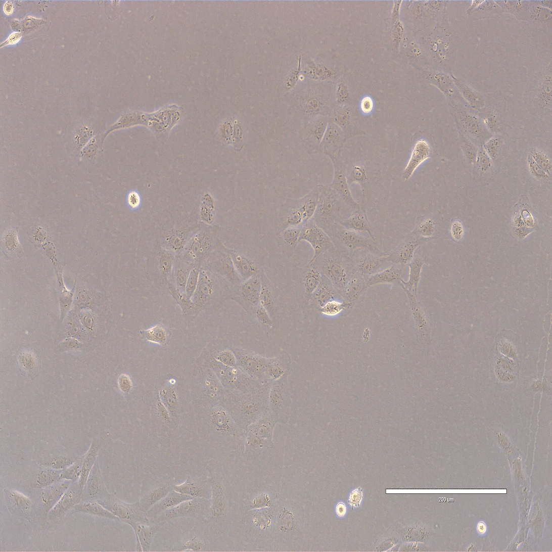 14日目に撮影されたVero細胞の画像。細胞は多様な形態を示すが、大部分は線維芽細胞様細胞または間葉系細胞の特徴である、ある程度の広がりを持つ細長いまたは紡錘形を呈する。少数の細胞は丸みを帯びており、これは有糸分裂活動、接着不良、あるいはストレスの初期兆候を示している可能性がある。全体的な細胞密度は低い。細胞は視野全体に均一に分布しており、時折小さな塊が見られる。細胞は健全に見え、膜は損なわれておらず、基質への接着は良好で、明らかな剥離や細胞質顆粒化の兆候は見られない。スケールバーは使用した対物レンズを示している。明らかな汚染の証拠は見られない。位相差顕微鏡。