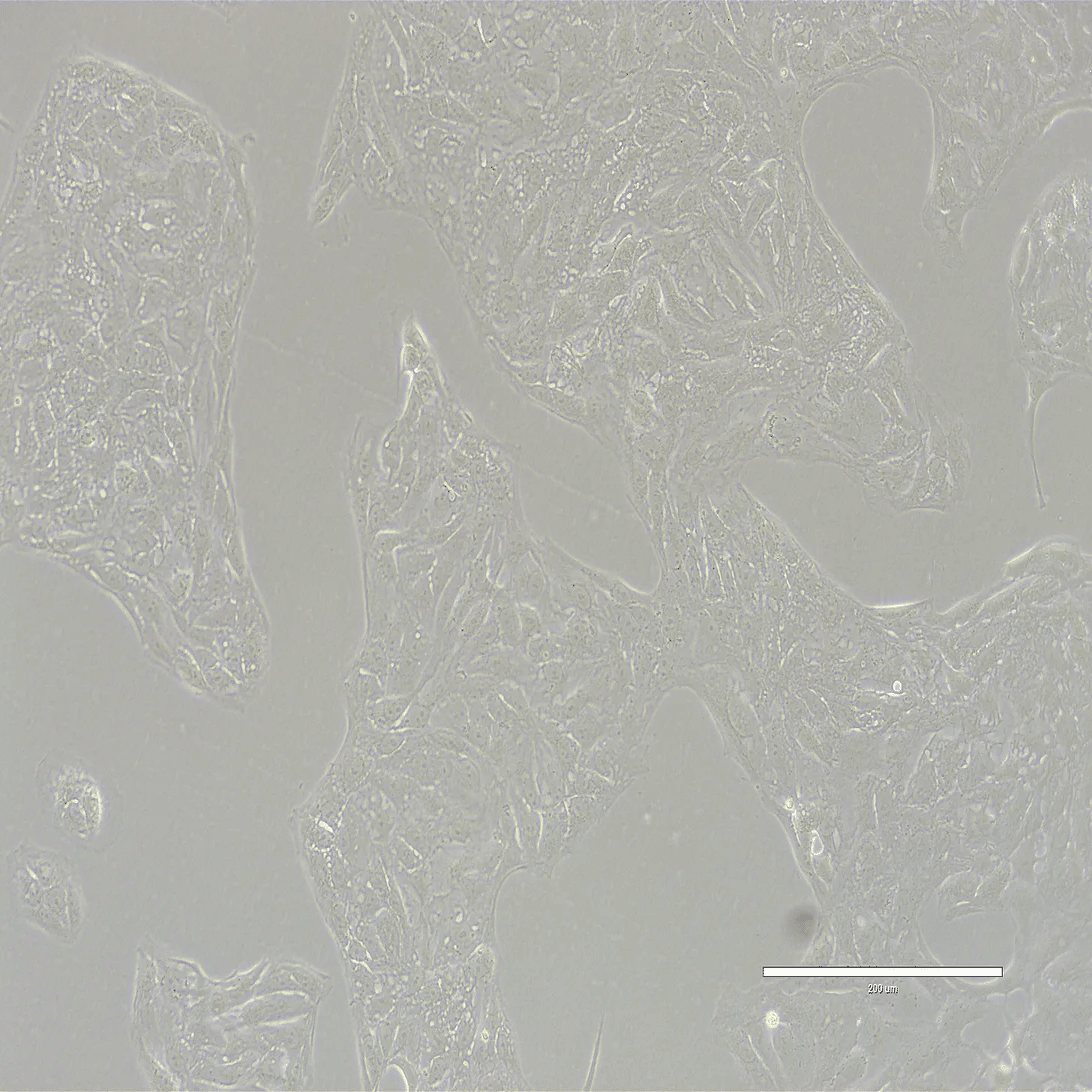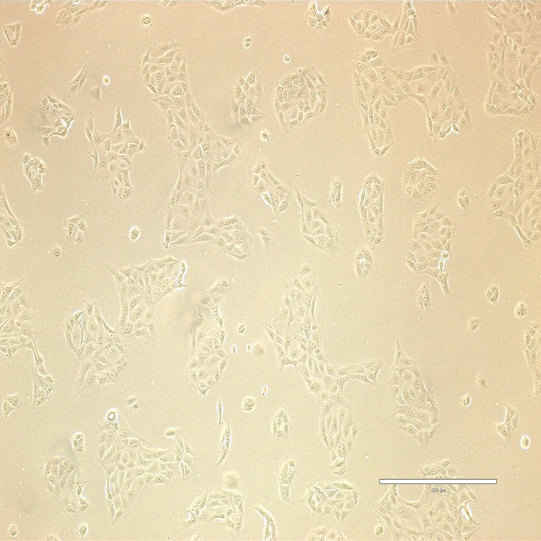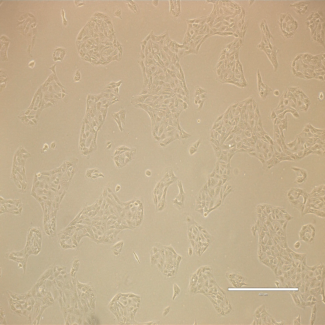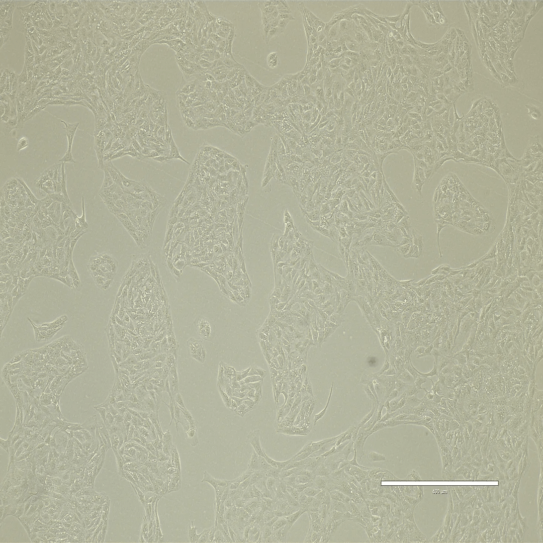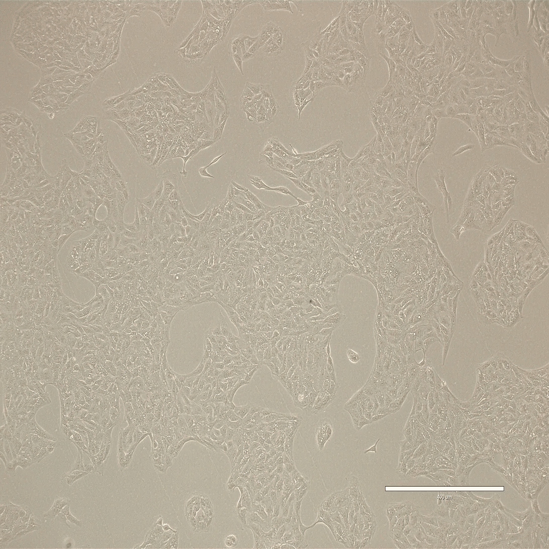 解凍後3日目に撮影したVero細胞の画像。細胞はクラスターまたはシート状に増殖しており、接着性単層に典型的な放射状のパターンを呈している。培養は50~60%のコンフルエントで、ほとんどの細胞は大きな細胞島を形成しており、大きな細胞間隙間が見られることから、単層がまだ完成していないことが示唆されている。細胞は典型的な多角形または細長い線維芽細胞様の形状を示し、細胞質の突出部が明瞭に観察され、核は明瞭に定義されている。細胞は健全に見え、細胞膜は損なわれておらず、基質への接着は良好で、明らかな剥離や細胞質顆粒化の兆候は見られない。スケールバーは使用した対物レンズを示している。明視野および位相差。