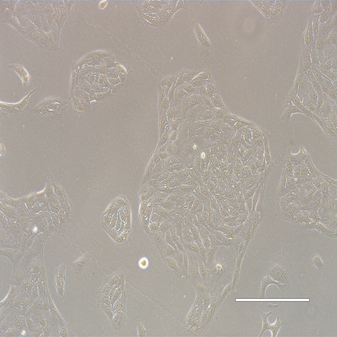 EXP_path1_passage4_201:ほとんどの細胞は接着しており、小さな塊となって増殖しています。分裂中の細胞:画像中央と12時の方向。