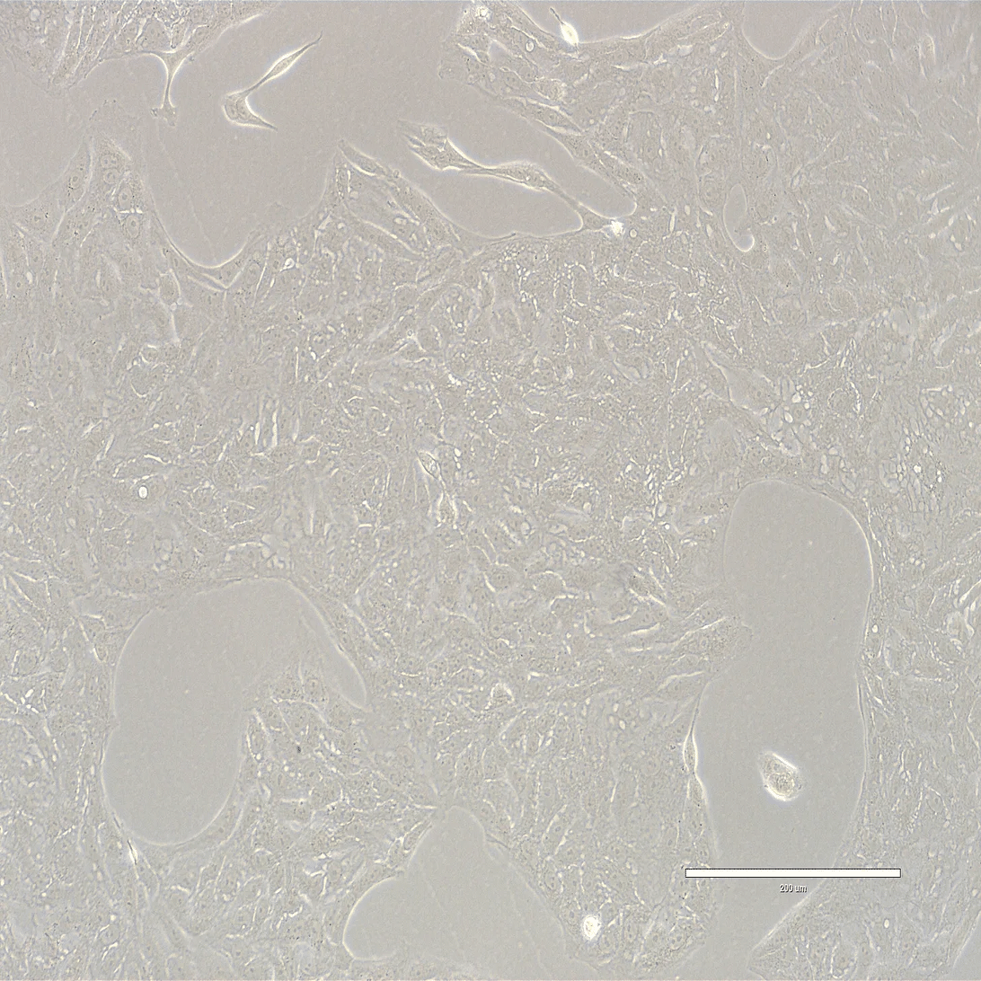 解凍後4日目に撮影したVero細胞の画像。細胞はシート状に増殖し、表面の大部分を覆っており、分裂細胞はほとんど見られない。細胞は典型的な多角形を呈し、核は明瞭に定義されている。細胞は健全に見え、膜は損なわれておらず、基質への接着は良好で、明らかな剥離や細胞質顆粒化の兆候は見られない。スケールバーは使用した対物レンズを示している。明視野および位相差。