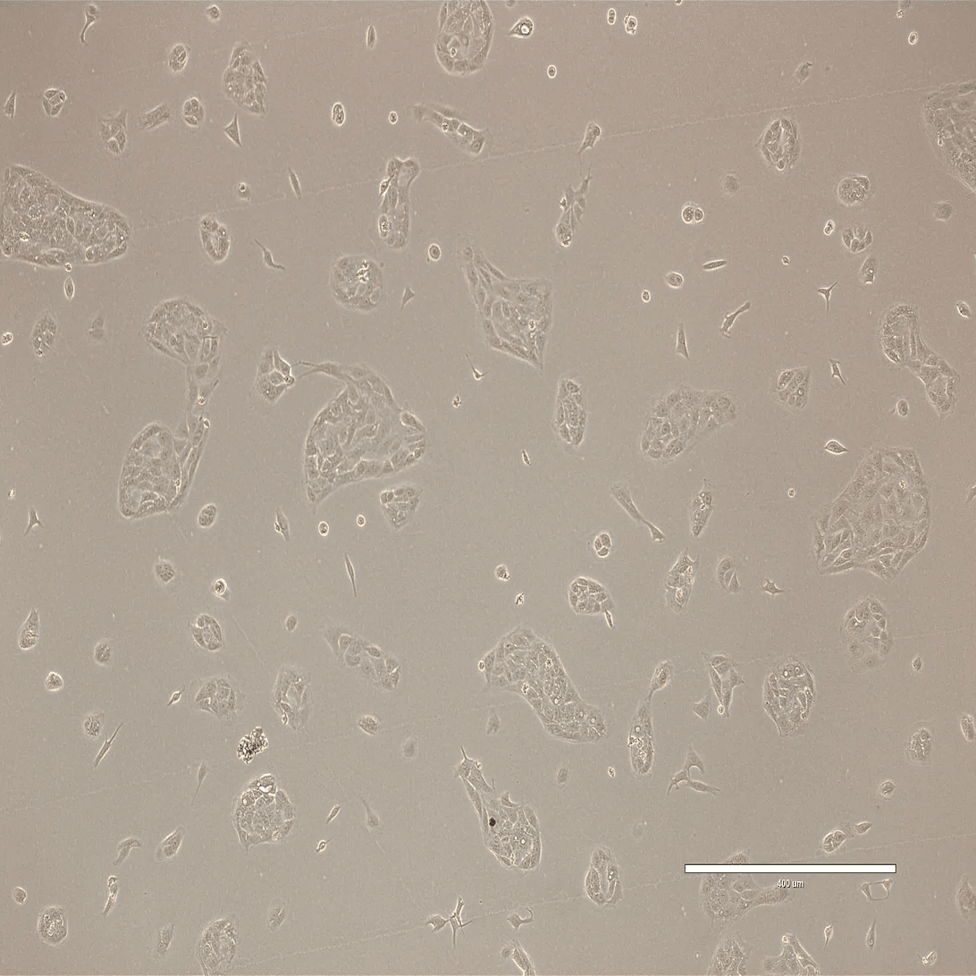 EXP_path1_passage4_401:細胞は接着しており、融合し始めているクラスター状に増殖しています。明るい分裂細胞はごくわずかです。視野の左下隅近くに有糸分裂像が見られます。