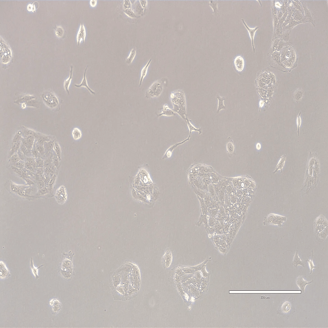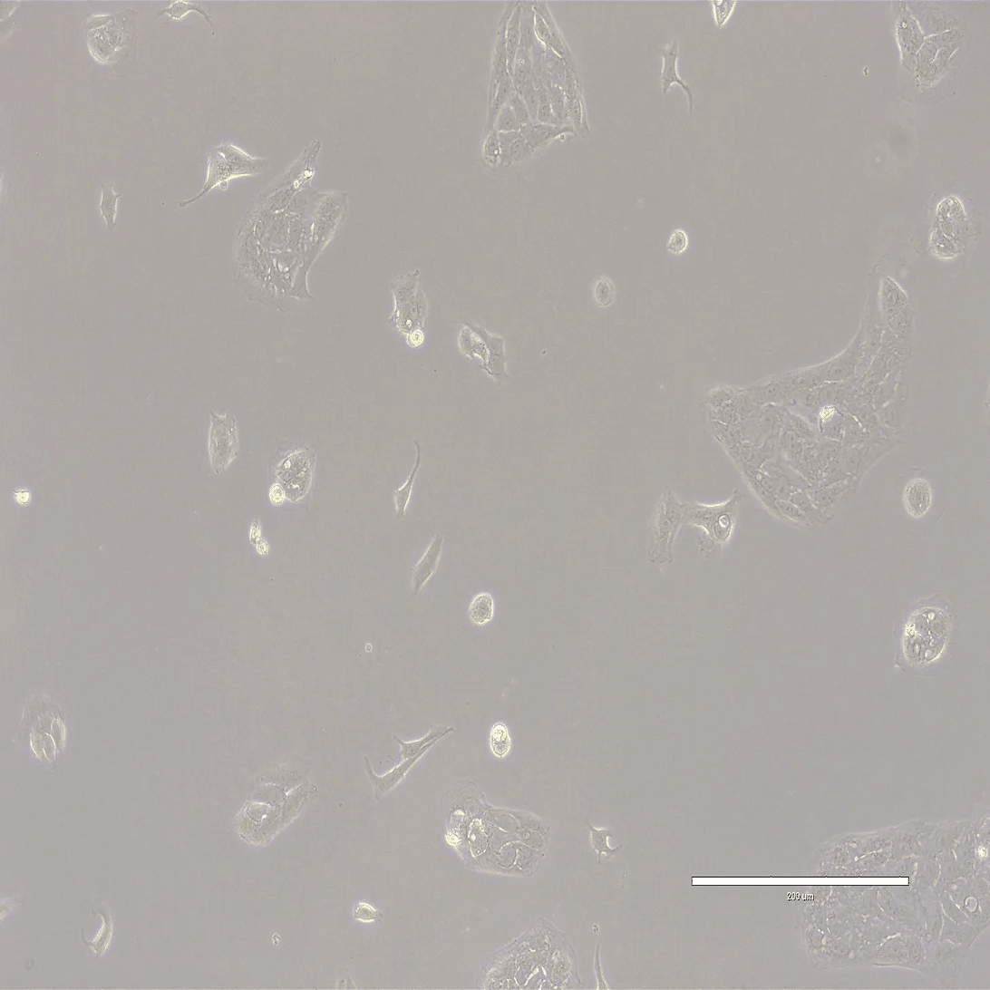 EXP_path2_passage4_101:少数の小さなクラスターが認められる。ほとんどの細胞は細長い形または紡錘形で、ある程度の広がりを呈している。複数の細胞は丸みを帯びており、一部は有糸分裂中である(中央)。