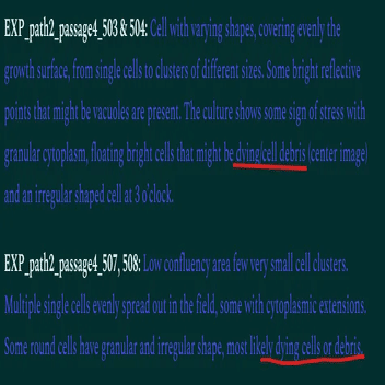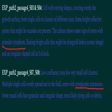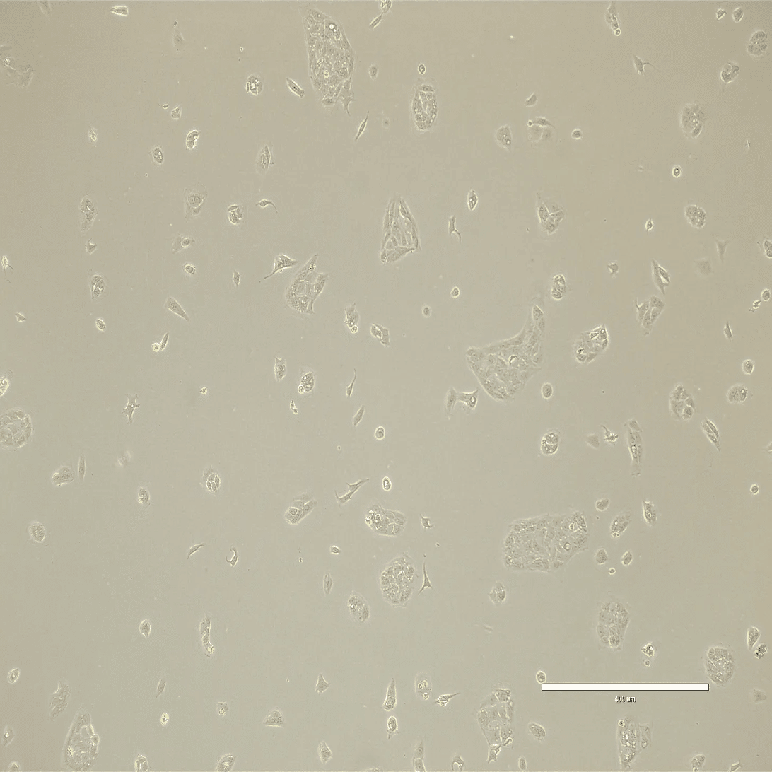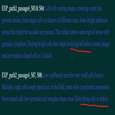 EXP_path2_passage4_402:いくつかの小さな塊が見られ、明るい点(液胞)がいくつか見られます。7時の方向に分裂細胞が2つあります。ある程度広がった複数の単一細胞があります。複数の丸い細胞があります。一部の細胞は丸みを帯び、屈折しており、死にかけている細胞を示唆している可能性があります(6時の方向)。