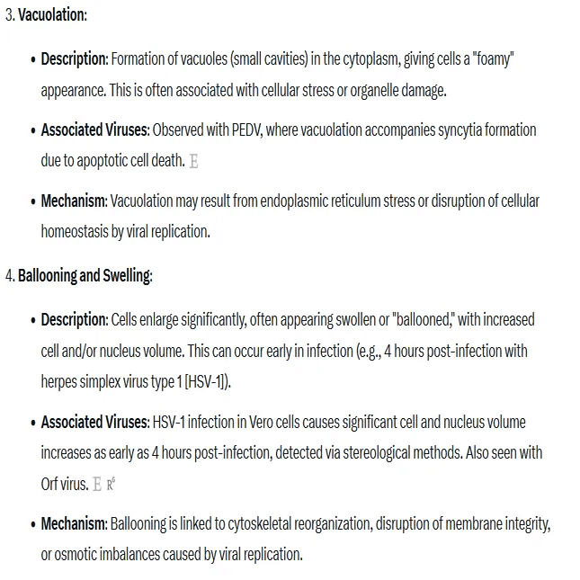 ここでは、標準的なウイルス感染症の細胞に見られる、特異的であると主張される細胞変性効果の形態とその説明を概説します。それぞれの形態について、公表されているウイルス感染症の画像例に加え、実験プレートの画像と、それらを実施した契約研究技術者による説明を示します。画像がある場合は、出典となった出版物へのリンクが貼られています。