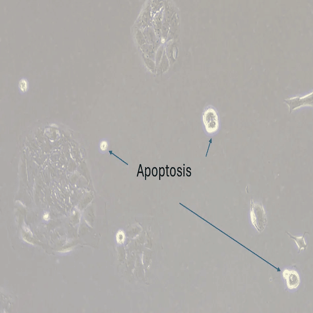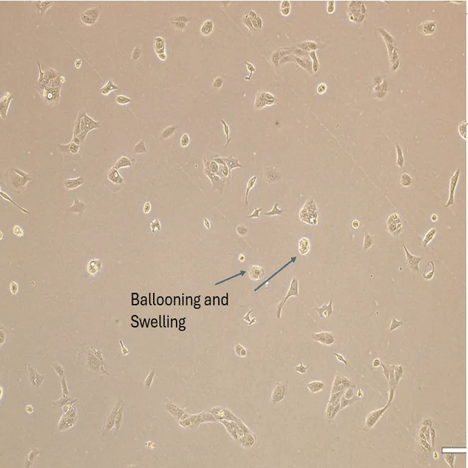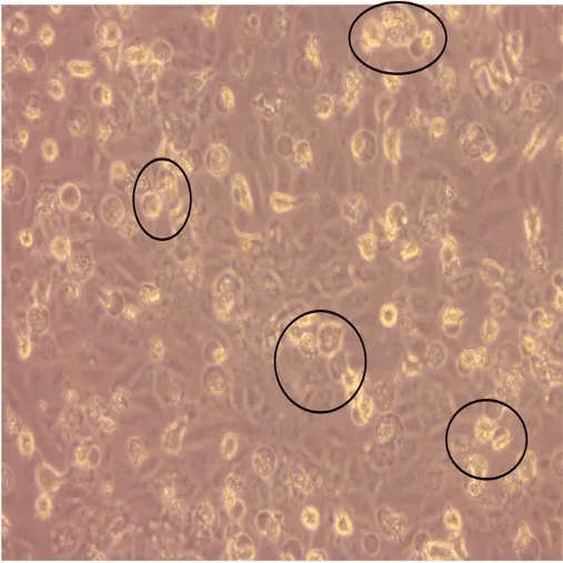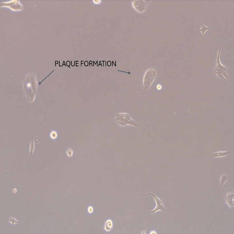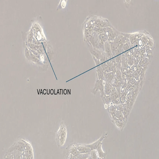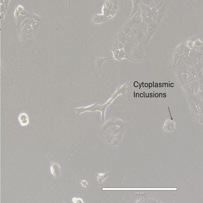 最初の研究では、培養1日目のコンフルエンスは~90%で、まだ成長を許すポケットがあり、DMEMは赤色のままであったことから、細胞が過密状態によって飢餓状態に陥っていないことが示されました。対照的に、本研究では両方のパスが~30%の低いコンフルエンスで開始され、成長培地パス1は最終的に~80%のコンフルエンスで成長しました。低FBSパス2では、細胞株の停滞とアポトーシスが見られ、CROによると5日目に~15%の低いコンフルエンスで終了しました。最初の研究のようにコンフルエンスがより高い割合で開始されていた場合、最初の研究で見られたようなシンクチアやプラーク形成などのより広範なCPE形態につながっていた可能性が高いと思われます。