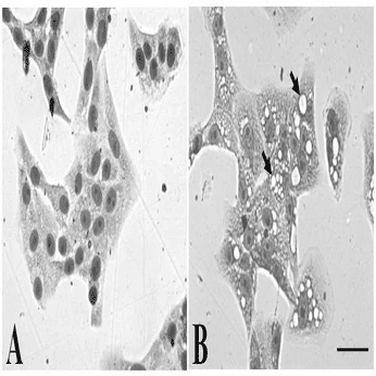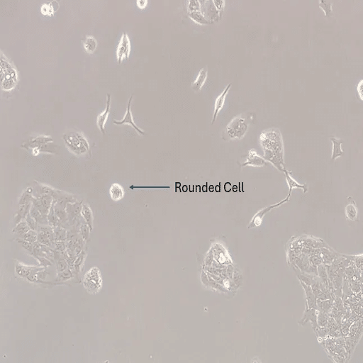 PREP_path1_passage1_303: 丸みを帯びた分裂細胞がいくつかあり、明るい反射点がいくつかあります。おそらく小さな破片ですが、汚染の明確な証拠はありません (例: 細菌または真菌の死骸)。
