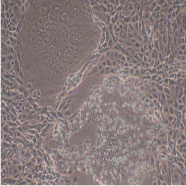 解凍後2日目に撮影したVero細胞の画像。ほとんどの細胞は接着性で、上皮細胞に特徴的な玉石状の形態を呈している。細胞はよく広がり均一に分布しているように見えるが、細胞塊の間には顕著な隙間がある。個々の細胞は楕円形から多角形で、明瞭な核と核小体が観察される(20倍)。培養液全体に明るい丸みを帯びた分裂細胞が認められる。細胞の境界は明瞭で、凝集、剥離、汚染の兆候は見られず、健全な増殖状態を示唆している。明視野顕微鏡および位相差顕微鏡による観察。