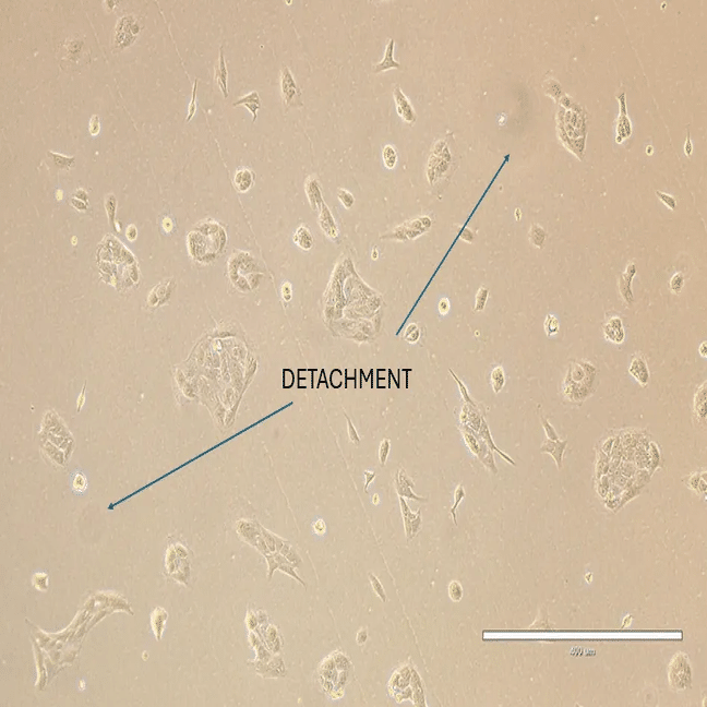 17日目に撮影したVero細胞の画像。細胞は多様な形態を示している。丸みを帯びた細胞は少なく、突出している細胞もいくつかあり、接着が維持されていることがわかる。全体的なコンフルエンシーは低く、複数の小さなクラスターと多数の単一細胞が認められる。細胞は健全に見え、膜は損なわれておらず、基質への接着も良好で、明らかな剥離の兆候は見られない。細胞質は緻密/顆粒状である。明るい反射点がいくつかあり、大きな液胞のように見えるものもあれば、細胞片のように見えるものもある。スケールバーは使用した対物レンズを示している。明らかな汚染の兆候は見られない。位相差顕微鏡による。