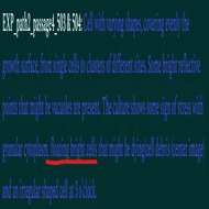 EXP_path2_passage4_303:いくつかの小さな塊が見られ、明るい点(液胞)がいくつか見られます。7時の方向に分裂細胞が2つあります。複数の単一細胞がある程度広がり、丸みを帯びています。