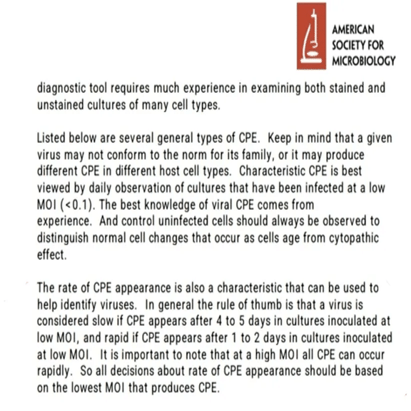 ここで、アメリカ微生物学会は、培養後 5 日間経過する前に培養物中に観察される CPE の形態は、ウイルスの存在を示す閾値を満たすのに十分であると述べています。