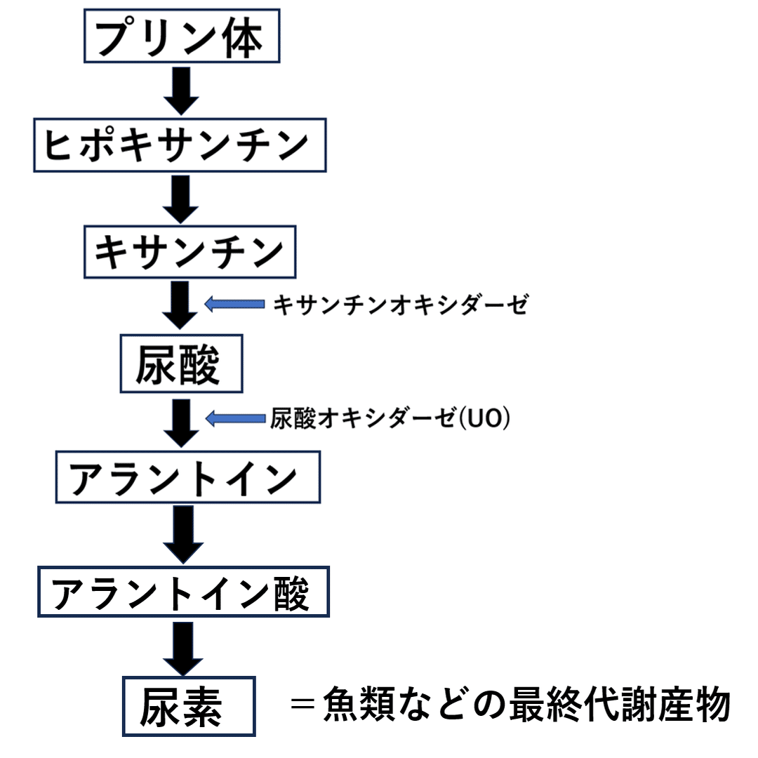 魚類では、アラントインをさらに代謝して、尿素まで分解します。
