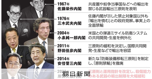 複数の政府・与党関係者が明らかにした。「5類型」は、2014年にそれまでの「武器輸出三原則」に代わって制定された「防衛装備移転三原則」の運用指針に盛り込まれている。