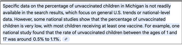 Googleの(役に立たない) AI によると、全米の調査では、アメリカでワクチン接種を受けていない子供の割合は 0.5% から 1.1% の間であると報告されている。