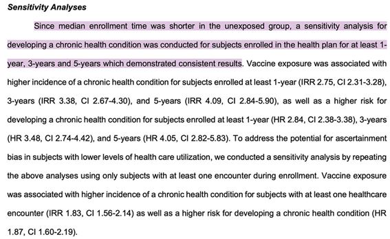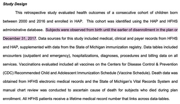 研究の中で、参加者たちの研究期間の長さに差があったことを示唆する部分は過敏症分析のセクションのみであり、著者らはワクチン未接種の子供に観察された差を補正するために適切な統計的措置を講じたことについて非常に明確に述べている。