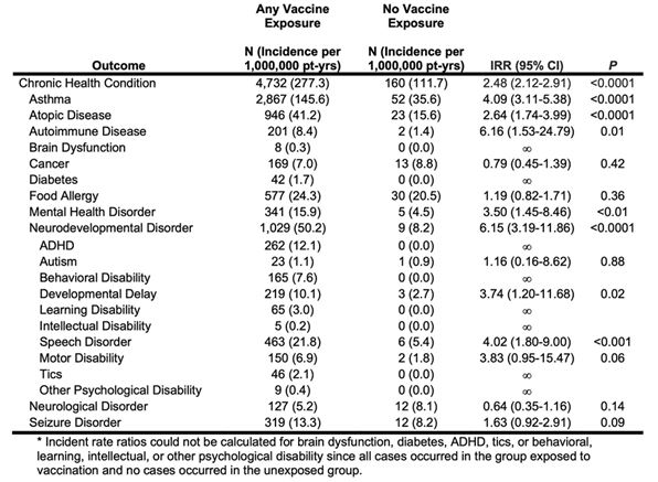 全体として、著者らは、小児期ワクチン接種を受けた子どもは、接種を受けていない子どもと比較して、慢性疾患を発症するリスクが250%(2.5倍)増加すると報告している。これは、ビッグファーマと医療産業複合体によって撤回を強いられたものも、現在も継続中のものも含め、ワクチン接種を受けた子どもと接種を受けていない子どもを比較した他の研究結果と一致している。