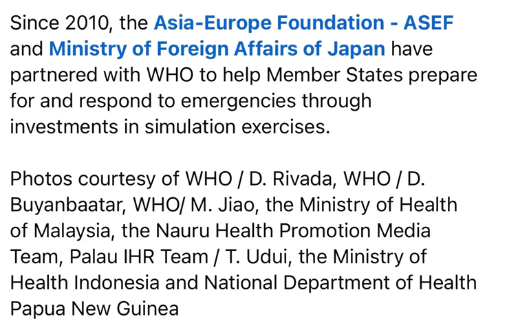 2010年以降、アジア欧州財団(ASEF)と日本外務省はWHOと連携し、加盟国が緊急事態への準備と対応を整えられるよう、危機対応シミュレーション演習への投資を通じて支援している。
