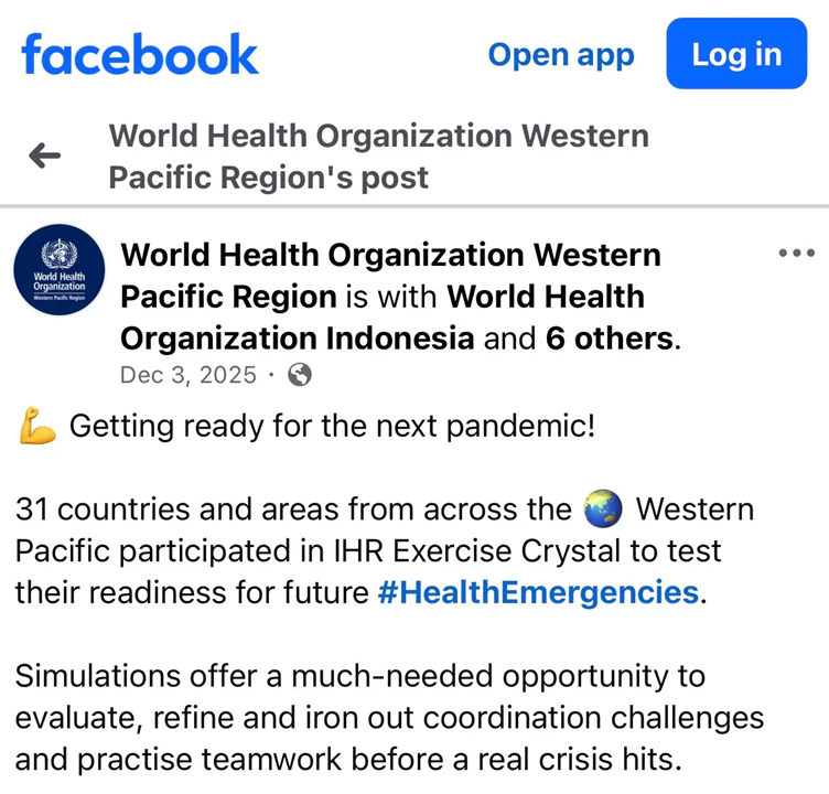 2026年02月03日 byナタリー・ウインターズ:https://nataliegwinters.substack.com/p/who-just-ran-a-simulation-for-the2025年12月、世界保健機関(WHO)は西太平洋地域全域で大規模なパンデミックシミュレーションを密かに実施した。国際保健規則(IHR)演習「クリスタル」と称されるこの訓練には31の国と地域が参加し、WHO自身によって「次のパンデミックに備える」と位置付けられました。