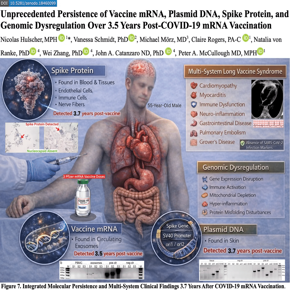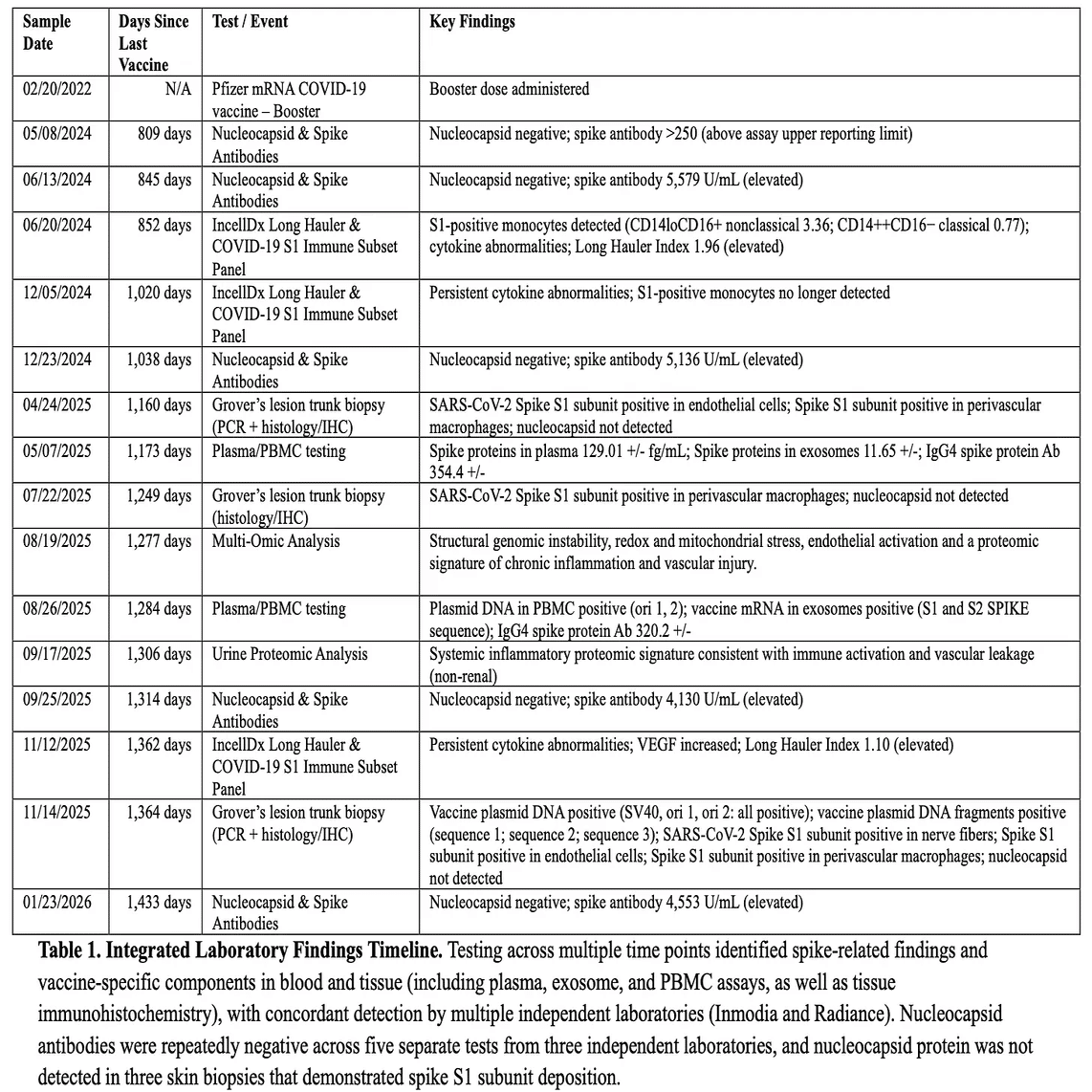 「COVID-19 mRNAワクチン接種後3年半にわたるワクチンmRNA、プラスミドDNA、スパイクタンパク質、ゲノム調節異常の前例のない持続」と題された論文は、私たちが知る限り、これまでで最も包括的なCOVID-19ワクチン障害症例報告であり、3年半以上にわたり、40回を超える救急外来受診、18の医療分野にわたる200回を超える専門医の診察、100件を超える臨床検査、100件を超える画像診断検査、複数の時点で実施された連続的な血液および組織サンプルの採取が含まれています。